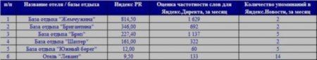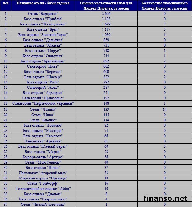 «Среди избираемых украинскими туристами новых интересных вариантов отдыха излюбленным для украинцев местом отдыха (при пустующих крымских пляжах) стала Бердянская коса», - пишут корреспонденты издания «Украина сегодня: Finanso.net».О популярности этих мест среди украинцев, а также выборе лучших отелей и баз отдыха Бердянской косы рассказали в издании «Биржевой лидер». Украинский туристический рынок, будучи очень многообразным, предлагает соотечественникам многочисленные туристические комплексы: конференц-залы со стереосистемами для проведения мероприятий, ресторанами, где можно отведать блюда национальной и европейской кухни. Многочисленны и разнообразны здесь услуги связи и Интернета и др. Полноценно и с удобствами позволяет отдохнуть украинцам такой уголок отдыха, как Бердянская коса, где расположились многочисленные дома отдыха, отели, автостоянки и торговые точки, став прекрасным вариантом для туристов, не располагающих большим бюджетом, но желающих отдохнуть у моря. Самые популярные базы отдыха в этом регионе.Рейтинг популярности домов отдыха и отелей на Бердянской косе был составлен на основании: - частоты слов для Яндекс.Директа «база отдыха/отель/санаторий плюс его название»; - числа упоминаний в электронных СМИ названий домов отдыха и отелей, рассчитанное с помощью агрегатора Янденкс.Новости. Регионом оценки была Украина. Отель «Бердянск» по данным оценкам стал самым популярным в этой зоне отдыха (2 606 запросов за месяц), предлагая своим посетителям все возможности для отдыха и развлечений, прекрасные условия для проживания, невысокие цены. Здесь будут в вашем распоряжении салон красоты, Интернет и конференц-залы, выполненные по спецпроекту бассейн с подогревом и сауна. Находясь в центре города, отель может стать для любителей экскурсий и активного отдыха отличным вариантом для ознакомления с музеями и достопримечательностями Бердянской косы. Вторую позицию по популярности (среди отелей) заняла база отдыха «Прибой» (2 103 запроса за месяц в Яндексе), отделенная от городской части соленым озером, обусловившим ее уникальность. Здесь вам могут предложить трехразовое питание в столовой, кафе и на пляже с не менее приятными ценами. На детской площадке отеля могут проводить свое время дети, а на еще одной, оборудованной всем необходимым набором принадлежностей, шашлыки на природе могут приготовить взрослые отдыхающие. Тройку популярных лидеров завершает база отдыха «Жемчужина» (1 626 запросов за месяц), расположенная прямо на берегу Азовского моря, где отдыхающие могут ожидать хорошего сервиса, уюта и комфортабельных номеров по вполне доступным для них ценам. На территории отеля расположился аквабол, рынок, а также рядом с базой отдыха находятся развлекательные заведения. Остальные участники этого рейтинга за месяц, согласно Яндекс.Директу, расположились с более скромными результатами: базы отдыха «Бриз», «Золотой берег», «Дельфин», «Южная», «Парус», «Славутич», «Бригантина». При общем числе запросов 16 029 на долю всей тройки лидеров пришлось почти сорок процентов, а на долю лидера - чуть больше шестнадцати процентов запросов пользователей. Наиболее эффективный пиар в Сети имели следующие базы отдыха этого региона: Среди лучших здесь: база отдыха «Жемчужина» (814 запросов), база отдыха «Бригантина» (345 запросов), 