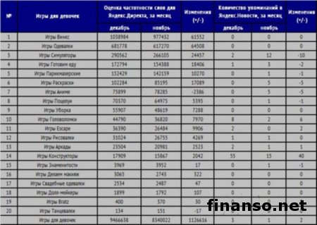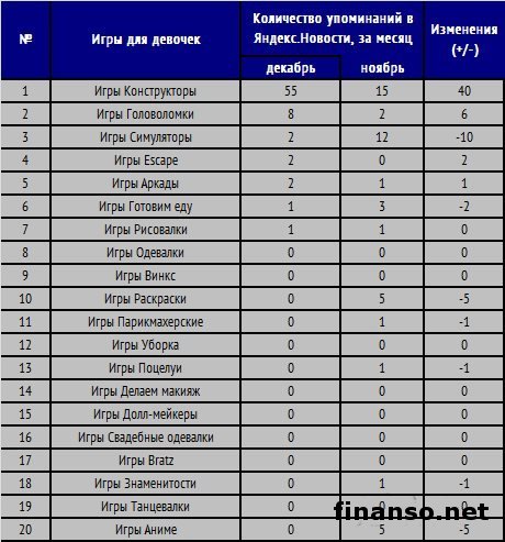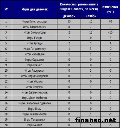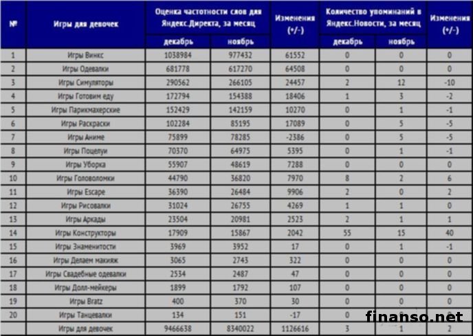 Став неотъемлемой частью жизни младшего поколения, игрой в компьютерные игры заняты все свободное время дети, а эта виртуальная реальность отличается сюжетом, заданиями, целями, персонажами и дизайном. Она помогает маленьким девочкам учиться ухаживать за детьми, создавая другой дизайн или образ, на свое усмотрение менять внешний облик персонажа. Об этом пишут корреспонденты издания «Украина сегодня: Finanso.net».Востребованностью компьютерных игр у российских девочек интересовалось издание «Биржевой лидер». Самые популярные для девочек игры в Интернете.На основании следующих критериев составлялся рейтинг популярности среди игр для девочек: рассчитанная с помощью сервиса wordstat.yandex.ru оценка частоты слов для Яндекс.Директа за месяц; число упоминаний в электронных медиа-ресурсах за этот период о игре для девочек, рассчитанная агрегатором Яндекс. Новости; регионом оценки являлась РФ. Проекту «Винкс» принадлежит первое место среди самых популярных для девочек игр, создание которой связано с транслируемым по телевидению одноименным мультфильмом «Клуб Винкс: школа волшебниц», рассказывающего о происходящих приключениях с добрыми феями, которые объединились для борьбы со злом. Игры «Одевалки» оказались на второй строчке по популярности, где украшая и переодевая на свой вкус персонажи, девочки проявляют свои таланты стилиста и дизайнера. Игры «Симуляторы» занимают третье место в названном рейтинге, имитируя, к примеру, управление самолетом, поездом, мотоциклом или автомобилем. Точное воспроизведение какой-то из тематических областей является основополагающим принципом симулятора. В то же время в Сети аутсайдерами рейтинга по своей популярности стали игры для девочек: «Знаменитости»; «Делаем макияж»; «Свадебные одевалки»; «Долл-мейкеры»; «Bratz»; «Танцевалки». В СМИ Яндекс.Новости самыми популярными стали. Без пиар-продвижения трудно увеличить популярность новинок игровой индустрии, повышая в электронных СМИ показатели их упоминаемости. Игры «Конструкторы» стали самым интересным игровым жанром в ноябре 2014 г., имеющем 55 упоминаний в СМИ за месяц. Игры «Головоломки» (восемь упоминаний) по своей популярности оказались на втором месте. Третье место по этому рейтингу заняли игры «Симуляторы», «Escape» и «Аркады» (по два упоминания). |
