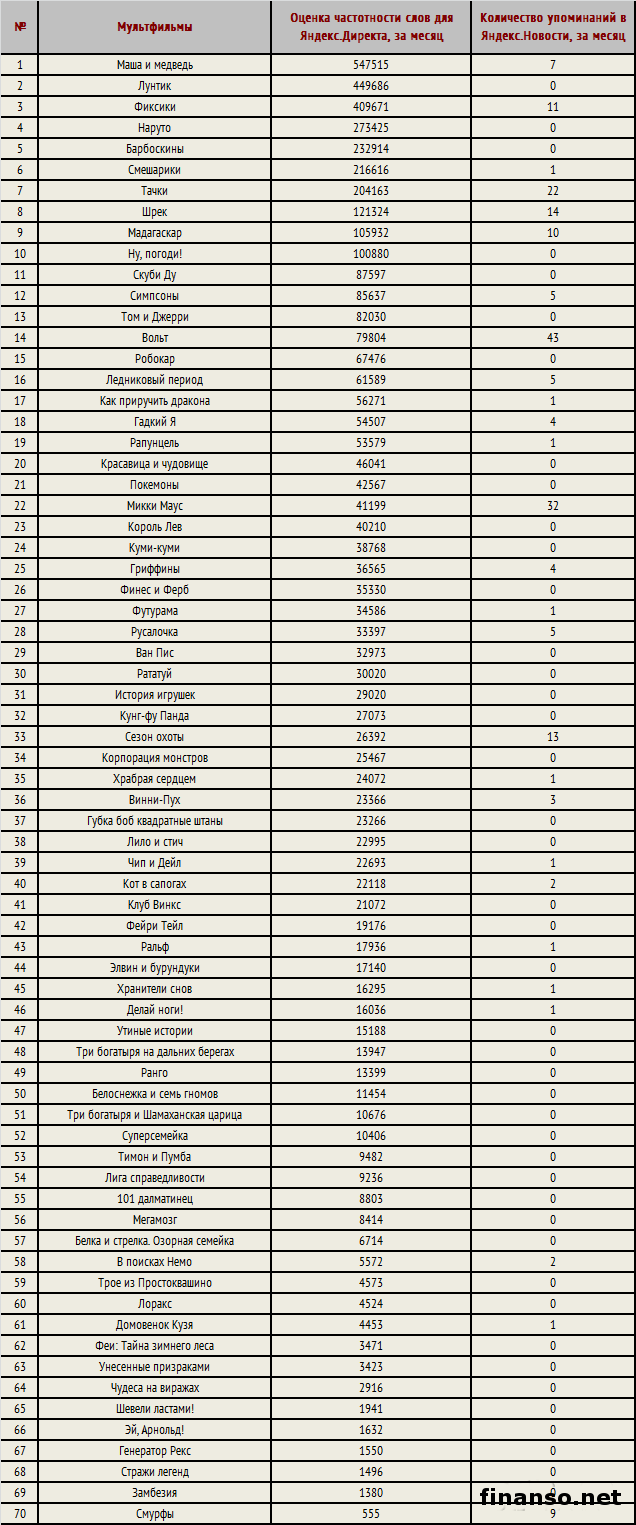 Анимационные картины на данный момент времени востребованы, как никогда. А все потому, что насыщенные и яркие сюжеты могут стать самым лучшим способом проведения досуга семьи. Дети с раннего возраста с большим удовольствием наблюдают за приключениями любимых героев. Мультипликация является при этом крайне значимым источником данных, может как-то помочь детям получить наиболее полезные и важные знания. Подробностями интересовались корреспонденты информационно-аналитического издания онлайн «Украина сегодня: Finanso.net». Какие именно из современных мультфильмов могут научить малышей только хорошему? Какие из них больше всего востребованы и популярны среди украинских детей? С этими вопросами разбирались специалисты экономического и политического журнала «Биржевой лидер». ТОП известности мультфильмов у украинцев в Сети.Рейтинг известности мультфильмов был сформирован на основе трех основных критериев: - оценка частотности слов для системы поиска Яндекс.Директ за месяц, что рассчитана при помощи сервиса wordstat.yandex.ru; - частота упоминаний о мультфильмах в интернет-изданиях Украины, что рассчитана при помощи агрегатора news.yandex.ru (Яндекс.Новости); - регион анализа (то есть поиска в сервисе wordstat.yandex.ru) – Украина. Первое место рейтинга известности мультфильмов у россиян занимает мультфильм «Маша и Медведь», который рассказывает об истории взаимоотношений неугомонной девочки Маши и большого, но доброго медведя. Второе не менее важное место рейтинга популярности в глобальной сети Интернет принадлежит анимационной телекартине «Лунтик», что собой представляет небольшое повествование о захватывающих приключениях пришельца с Луны. Закрывает ТОП-3 лидеров рейтинга известности анимационный российский мультсериал «Фиксики», что повествует о целой семье маленьких человечков, которые живут внутри техники, исправляют различные ее поломки. Аутсайдерами известности в текущем месяце стали следующие мультфильмы: - Шевели ластами! – 1 941 запрос в системе поиска Яндекс; - Эй, Арнольд! – 1 632 запроса в системе поиска Яндекс; - Генератор Рекс – 1 550 запросов в системе поиска Яндекс; - Стражи легенд – 1 496 запросов в системе поиска Яндекс; - Замбезия – 1 380 запросов в системе поиска Яндекс; - Смурфы – 555 запросов в системе поиска Яндекс. |