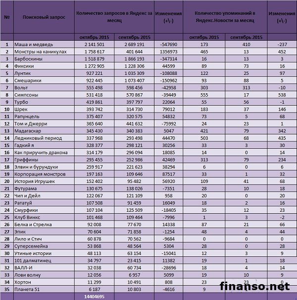 В настоящие время мультфильмы считаются просто отличным способом проведения семейного досуга. Самые маленькие зрители с большим интересом наблюдают за наиболее яркими анимационными сюжетами с наиболее интересными героями. Кроме того, многие взрослые совсем не против присоединиться к просмотру/организовать поход в кино, потому что на протяжении всего последнего времени множество достойных премьер выходит на телеэкраны. В то же время мультфильмы принято считать хорошим источником познавательной и нужной информации, им под силу оказать помощь ребенку в вопросе получения определенных знаний. Подробностями интересовались корреспонденты издания «Украина сегодня: Finanso.net».Какие мультипликационные фильмы признаны самыми известными среди россиян в глобальной сети Интернет? Ответ на этот вопрос искали журналисты сайта «Биржевой лидер». ТОП-популярных мультфильмов среди россиян в сети Интернет.Рейтинг известности мультфильмов был сформирован на основе трех основных критериев: - оценка частотности слов для системы поиска Яндекс.Директ за последние 30 дней, рассчитанная при помощи специального сервиса wordstat.yandex.ru; - частота упоминаний о мультиках в интернет-изданиях РФ, что рассчитана при помощи особого агрегатора news.yandex.ru (Яндекс.Новости); - регион анализа (то есть поиска в сервисе wordstat.yandex.ru) – Россия. - первое место рейтинга известности мультфильмов среди россиян отдано по праву мультфильму «Маша и Медведь». Этот мультик повествует об истории взаимоотношений медведя и маленькой неугомонной девочки. Дети с большим интересом могут по несколько раз просматривать одну и ту же самую серию. Данный мультфильм признан одним из наиболее часто просматриваемых в соцсети YouTube; - вторая позиция отдана по праву мультфильму «Монстры на каникулах». Граф Дракула для себя и любимой дочери возвел отлично укрытый от посторонних отель, куда монстры со всего мира прибывают на отдых от семейных забот, повседневной суеты и людей. Однако вездесущие туристы из Америки проникают даже сюда. Третья позиция отдана мультику «Барбоскины», повествующему о дружной семье собак, где папа любит играть в ПК, сыновья увлекаются футболом, а дочки интересуются модой и красотой. Далее следуют: - Фиксики - 1 272 905 запросов в Яндексе; - Лунтик - 927 221 запрос в Яндексе; - Смешарики - 922 445 запросов в Яндексе; - Вольт - 555 498 запросов в Яндексе; - Симпсоны - 531 418 запросов в Яндексе. |