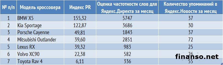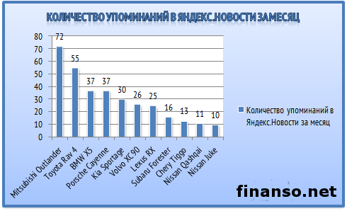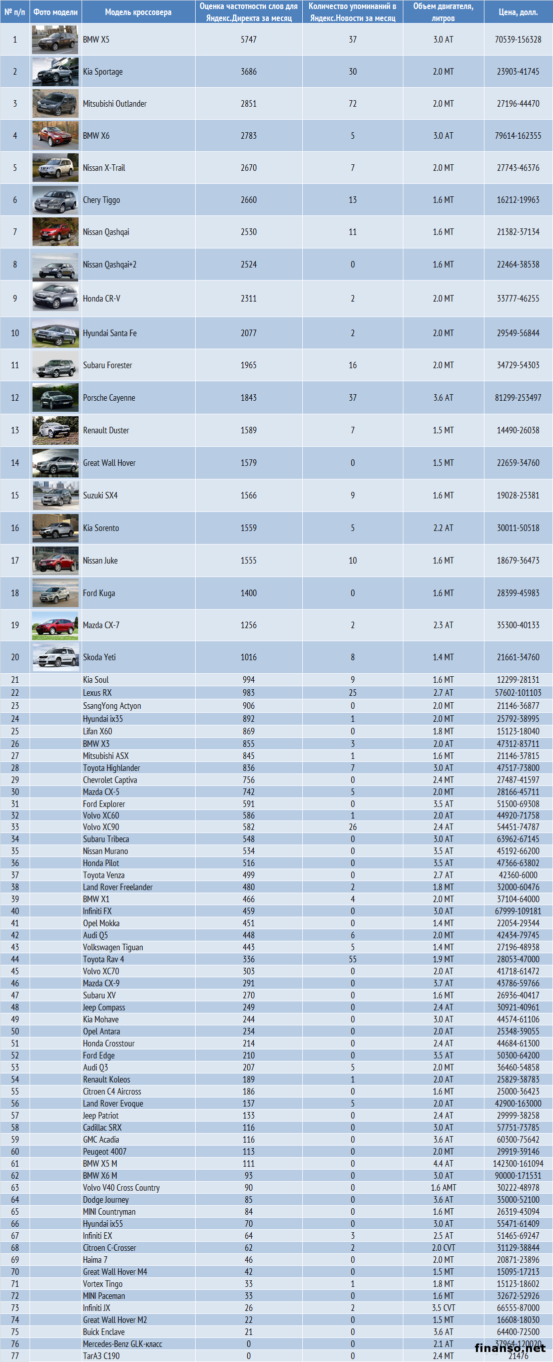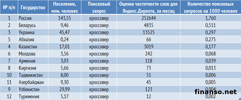 Насколько же популярными среди украинцев являются разные модели кроссоверов, разбирались аналитики издания для инвесторов "Украина сегодня: finanso.net". Лидер рейтинга популярности – "BMW X5".Формирование рейтинга популярности кроссоверов базировалось на следующих критериях: - оценка частотности слов для Яндекс.Директа за месяц (расчет проводится с помощью сервиса wordstat.yandex.ru); - частота упоминаний о кроссоверах в украинских интернет-СМИ (рассчитывается с помощью агрегатора Яндекс.Новости- news.yandex.ru); - регион анализа (таким образом и поиска в сервисе wordstat.yandex.ru) – Украина; - период анализа – с 10 марта по 10 апреля 2014 года. Первую позицию рейтинга уверенно занимает "BMW X5" (5747 запросов украинцев в поисковой системе Яндекс за анализируемый период). Самыми важными преимуществами данного авто считаются хорошая проходимость, вместительный багажник, мощный двигатель и высокий уровень эргономики. Приятным бонусом является также стильный дизайн кроссовера. На второй ступени рейтинга популярности кроссоверов оказался автомобиль "Kia Sportage" (3686 запросов украинцев в Яндексе за месяц). Среди основных преимуществ данного авто стоит отметить хорошую шумоизоляцию, высокую посадку, отличную управляемость и хорошую проходимость. Радует также и цена кроссовера: среди представленных в рейтинге автомобилей, "Kia Sportage" – один из самых доступных. Третье место рейтинга журнала для инвесторов "Украина сегодня: finanso.net" занял кроссовер "Mitsubishi Outlander" (2851 запрос украинцев в Яндексе с 10 марта по 10 апреля 2014 года). Именно про этот автомобиль можно сказать - отличное сочетание цены и качества. При довольно высокой ценовой доступности кроссовер обладает хорошей управляемостью и обзорностью, имеет вместительный багажник и располагает просторным салоном. В пятерку лидеров по популярности вошли также автомобили "BMW X6" (2783 запроса украинцев в Яндексе за месяц) и "Nissan X-Trail" (2670 запросов). Аутсайдерами по популярности в Яндексе среди украинцев оказались следующие модели кроссоверов: - "Haima 7" (46 запросов украинцев в Яндекс с 10 марта по 10 апреля 2014 года); - "Great Wall Hover M4" (42); - "Vortex Tingo" (33); - "MINI Paceman" (33); - "Infiniti JX" (26); - "Great Wall Hover M2" (22); - "Buick Enclave" (21); - "Mercedes-Benz GLK-класс" (0); - "ТагАЗ C190" (0). Реже всего кроссоверами интересуются жители Туркмении.При помощи сервиса wordstat.yandex.ru можно определить, жители каких стран СНГ интересуются информацией о кроссоверах чаще всего. При этом в целях сравнительного анализа все статистические данные переводятся в расчете на 1 тысячу населения: Данные представленной таблицы демонстрируют следующие факты: - наибольшую заинтересованность в кроссоверах продемонстрировали в анализируемом периоде жители России – на 1 тысячу россиян пришлось 1,8 запроса в Яндексе за месяц; - значительно рее кроссоверами интересовались жители Беларуси – на 1000 населения здесь пришлось немногим более 0,5 запроса в Яндексе за месяц; - украинцы искали информацию о кроссоверах в Яндексе и того реже: на 1000 жителей Украины пришлось менее 0,3 запроса за месяц; - наименьшую (практически нулевую) заинтересованность в информации о кроссоверах продемонстрировали жители Таджикистана, Азербайджана, Узбекистана и Туркмении – в этих странах на 100 тысяч населения пришлось менее 1-го запроса в Яндексе. Что ищут в Яндексе украинцы, вводя запрос "кроссовер"?Данные сервиса wordstat.yandex.ru позволяют определить, какой име