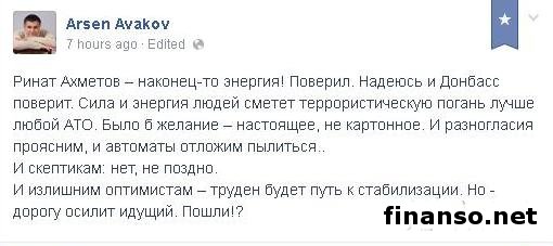 Стало известно, что Арсен Аваков, глава Министерства внутренних дел Украины, одобрительно отреагировал на заявление украинского олигарха Рината Ахметова, которое было направлено на осуждение деятельности сторонников самопровозглашенной так называемой «Донецкой народной республики», а также действий пророссийски настроенных активистов на Донбассе. Свой положительный ответ на заявление бизнесмена А. Аваков разместил на своей страничке в социальной сети Facebook.