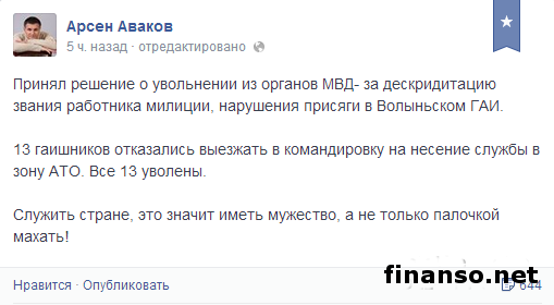 Как передают корреспонденты издания «Украина сегодня: Finanso.net», при этом глава Министерства внутренних дел Украины отметил, что «служить родине – это значит иметь мужество, а не только махать палочкой». Личная недисциплинированность стала причиной увольнения.В своем аккаунте Арсен Аваков написал: «Принял решение об увольнении из органов МВД – за дискредитацию звания работника милиции, нарушения присяги в Волыньском ГАИ. Тринадцать гаишников отказались выезжать в командировку на несение службы в зону антитеррористической операции (АТО). Все тринадцать были незамедлительно уволены». При этом в сообщении министра, но уже на официальном сайте Министерства внутренних дел, отмечается, что Арсен Аваков принял решение об увольнении тринадцати сотрудников роты дорожно-патрульной службы из органов внутренних дел. Причиной этому, по словам главы МВД, стала «личная недисциплинированность, а также за отказ от выполнения заданий, определенных законом Украины «О борьбе с терроризмом», и от несения службы по охране общественного порядка в районах проведения антитеррористической операции (АТО)». Сообщим, что в сообщении также отмечается, что сотрудники Государственной автоинспекции нарушили присягу правоохранителя, служившего Украине, а также они отказались выполнять требования законов украинского государства «О дисциплинарном уставе органов внутренних дел», «О милиции», а еще – приказов управления ГАИ и МВД Украины. Потери украинских силовиков в боях АТО.Напомним, сегодня, когда журналисты задавали вопрос исполняющему обязанности министра обороны Украины Михаилу Ковалю о количестве погибших за время проведения АТО украинских военнослужащих, он ответил, что в бою с террористами были убиты фактически два вертолетных экипажа. Кроме того, по словам М. Коваля, есть потери и среди десантников. «Это немного больше двадцати человек. И так как у военных есть суеверия, то я не хотел бы приводить точную цифру погибших». |
