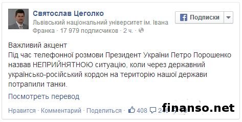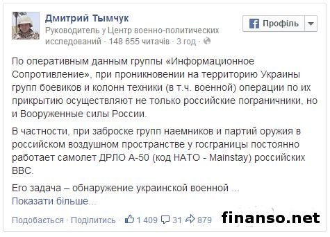 Тымчук сообщил о том, что, в частности, во время заброски групп наемников с партиями оружия на территорию Украины в российском воздушном пространстве у государственной границы постоянно находится самолет ДРЛО А-50 российских военно-воздушных сил. По словам эксперта, задачей этого самолета является обнаружение украинской авиации, которая может сорвать операцию по заброске российских боевиков на территорию Украины. Кроме того, Тымчук рассказал о том, что у него имеется информация относительно того, что непосредственно перед проникновением террористов в Украину российские беспилотники осуществляют разведку территории. Напомним, что ранее Арсен Аваков рассказал о том, что из Российской Федерации на территорию Украины через захваченные сепаратистами пункты пропуска на границе прошла колонна военной техники. В частности, танки, БТР и бронированные автомобили. Порошенко напомнил Путину о недопущении пересечения границы.Отметим, что во время разговора Петра Порошенко с Владимиром Путиным президент Украины назвал неприемлемой ситуацию, когда границу Украины со стороны Российской Федерации пересекают танки и тяжелая военная техника. Такую информацию на своей странице в социальной сети Facebook сообщил Святослав Цеголко, пресс-секретарь президента. Уже неоднократно были зафиксированы случаи проникновения российских боевиков, которые перевозили с собой вооружение, а также танки, БТР и другую военную технику на Украину со стороны Российской Федерации. Ранее эти попытки пресекали украинские пограничники, но после того, как террористы сумели захватить несколько пограничных пунктов, через них беспрепятственно проходят террористы вместе с военной техникой, и сейчас нельзя достоверно сказать, сколько вооружения было переправлено на Донбасс. |