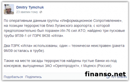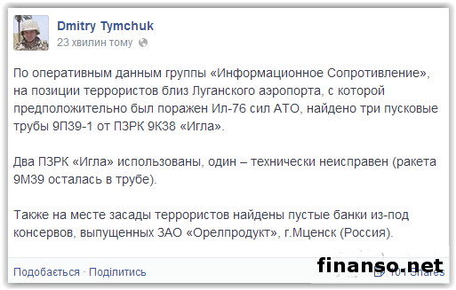 Как это было.Напомним, что в ночь на 14 июня террористы так называемой Луганской народной республики сбили самолет украинских ВВС, когда тот заходил на посадку в луганском аэропорту. Боевики открыли огонь по самолету Ил-76, на борту которого находились десантники, из зенитной установки и крупнокалиберного пулемета. Отмечается, что данный самолет осуществлял транспортировку личного состава с целью его ротации. На борту кроме 49 десантников находилась военная техника, снаряжение и продовольствие. По информации Дмитрия Тымчука, координатора группы "Информационное сопротивление", на позиции, с которой предположительно был поражен самолет Ил-76 сил антитеррористической операции, было найдено три пусковые трубы от установки ПЗРК 9К38 "Игла". Из них два ПЗРК были использованы, а один – технически неисправен, в нем ракета 9М39 осталась в трубе. Кроме того, Тымчук отметил, что на месте были найдены пустые банки из-под консервов, выпущенных ЗАО "Орелпродукт", который находится в городе Мценск Российской Федерации. Отметим, что это уже далеко не первый случай атаки на украинские самолеты боевиками ДНР и ЛНР. Так, террористы, которые располагаются в городе Славянск, сбили самолет Ан-30, перевозивший гуманитарную помощь. По самолету было совершено два выстрела из ПЗРК с одного из блокпостов боевиков. Сообщается о том, что пилоты подбитого террористами самолета делали все возможное для того, чтобы увести его от жилых кварталов Славянска. После попадания ракеты в самолет он начал падать на жилые кварталы города, но умелыми действиями пилотов самолет был отведен от Славянска. Некоторые члены экипажа успели совершить прыжок из горящего самолета. Уже была проведена эвакуация экипажа с места падения самолета, раненые пилоты были доставлены в медицинские учреждения для оказания необходимой помощи. |