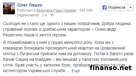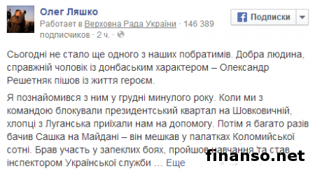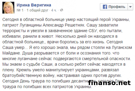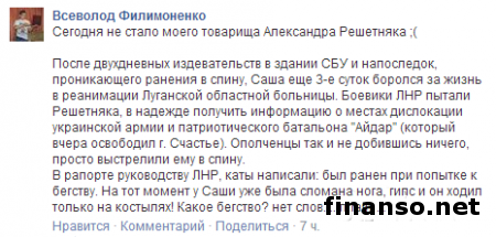 По сообщению Филимоненко после двух дней издевательств в здании СБУ, а также проникающего ранения в спину, Решетняк еще трое суток боролся за собственную жизнь в реанимационном отделении Луганской областной больницы. Как сообщил товарищ погибшего, террористы в здании СБУ надеялись получить от него информацию относительно мет базирования украинских военнослужащих, а также представителей патриотического батальона «Айдар». Кроме того, Филимоненко сообщил о том, что, не получив от активиста Евромайдана никакой полезной информации, боевики выстрелили ему в спину, а в рапорте руководителям ЛНР написали, что Решетняк был ранен при попытке побега, но в тот момент у активиста уже была сломана нога и на ней был наложен гипс, а ходить он мог только на костылях. Отметим, что активиста луганского Евромайдана Александра Решетняка похитили 10 июня в Луганске, а уже через два дня его отпустили, и он был помещен на госпитализацию в Луганскую областную больницу. Как сообщили его знакомые, он никогда особо не интересовался политикой, и единственное против чего он выступал, – это произвол чиновников. Люди скорбят о смерти погибшего активиста.После того как появились сообщения о том, что Александр Решетняк скончался многие люди начали выражать свои соболезнования. Так, Ирина Веригина – и. о. главы Луганской областной государственной администрации - написала на своей странице в социальной сети Facebook о том, что она очень хорошо его знала, поскольку они вместе стояли на луганском Евромайдане, и ее душа разрывается от боли и осознания того, что еще много людей находится в смертельной опасности. Кроме того, Олег Ляшко на своей странице в Facebook сообщил о том, что он познакомился с активистом в декабре прошлого года, и добавил, что Александр был настоящим героем, порядочным, трудолюбивым и добрым человеком, выразив свои соболезнования в связи с его гибелью. |
