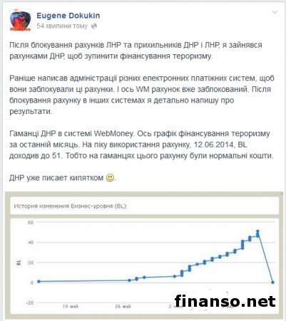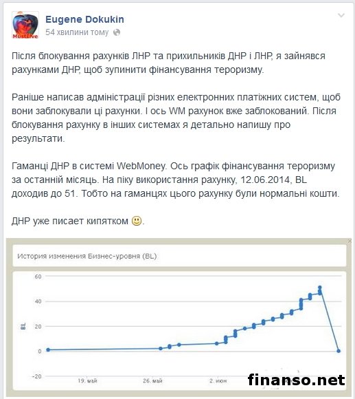Поэтому сейчас все службы мира сосредоточены на блокировании счетов, через которые террористам поступают средства, а все «инвесторы» привлекаются к ответственности. К поиску источников финансирования подключились и украинские активисты. Так, 13 июня киевлянин Eugene Dokukin рассказал на своей странице в социальной сети Facebook о том, что были блокированы многочисленные счета Валерия Болотова и Луганской народной республики в таких платежных системах, как Яндекс.Деньги, WebMoney и QIWI. Сколько средств получали террористы через платежные системы?Конечно, точные суммы финансирования террористов известны только администрации платежных систем, но если взять во внимание «бизнес уровень» аккаунтов ЛНР, то можно сделать вывод, что сумма финансирования составила несколько сот тысяч гривен, начиная с 26 мая по 12 июня, что видно на предоставленной диаграмме. Чем грозит украинцам финансирование терроризма?Отметим, что в случае возбуждения уголовного дела платежная система сообщает правоохранительным органам полное досье, а также всю информацию о движении средств на счету подозреваемого. Учитывая, что в платежных системах нет анонимных счетов, а на Валерия Болотова и ЛНР уже были открыты уголовные дела, список украинцев, финансировавших террористов, уже в ближайшее время попадет в руки правоохранительных органов. Аналитики журнала для инвесторов «Биржевой лидер» удивляются тому, что многие украинцы в социальных сетях чуть ли не с гордостью пишут о том, что они отправили средства на счета террористов, поскольку по УК Украины финансирование террористической организации предусматривает санкцию до пяти лет лишения свободы. Но это не останавливает террористов, и они размещают все больше объявлений, для того, чтобы вовлечь в свою преступную деятельность как можно большее количество людей. |