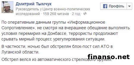 По его словам, силы антитеррористической операции продолжают соблюдать требования мирного плана Петра Порошенко по урегулированию ситуации на востоке Украины и не ведут боевых действий. Подразделения АТО выполняют задачи по охране блокпостов и определенных участков государственной границы Украины. В то же время боевики не прекращают обстреливать силовиков с территории ряда населенных пунктов, которые граничат с городом Славянском. Селезнев отметил, что во время обстрела боевики использовали гранатометы АГС-17, а также подствольные гранатометы. Было зафиксировано несколько фактов обстрела позиций сил АТО из минометов. Потерь среди украинских военнослужащих нет. Также Селезнев рассказал о том, что блокпост на дороге Северодонецк-Старобельск прошлой ночью был обстрелян боевиками из автоматического оружия. Силовики смогли отразить нападение при помощи ответного огня. Потерь среди военнослужащих нет. Что говорит Тымчук?В свою очередь Дмитрий Тымчук, руководитель Центра военно-политических исследований, сообщает о том, что несмотря на вчерашнее обещание представителей террористов прекратить ведение огня, боевики продолжают обстреливать позиции силовиков, чем срывают процесс мирного урегулирования ситуации на востоке Украины. В частности, ночью боевики произвели обстрел блокпоста сил антитеррористической операции в Луганской области из автоматического оружия. Напомним, что вечером 23 июня в Донецкой областной государственной администрации проходили многосторонние переговоры по вопросам урегулирования ситуации, в которых принимали участие представители ОБСЕ, Российской Федерации, террористических организаций ЛНР и ДНР, а также украинские политики и представители общественных организаций. Во время этих переговоров стороны смогли договорить о прекращении ведения огня до 10 утра 27 июня. Отметим, что 27 июня состоится подписание Соглашения об ассоциации Украины с ЕС. |