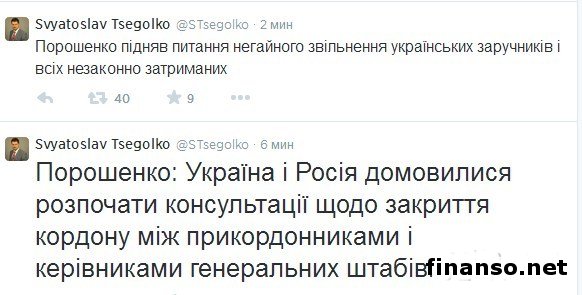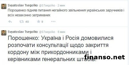 Как удалось выяснить корреспондентам издания «Украина сегодня: Finanso.net», украинский лидер сказал: «Мы договорились, что консультации пограничников, целью которых будет обеспечение реализации этого требования, то есть – установления контроля на российско-украинской границе, начнутся немедленно». Также украинский лидер настоял на том, что для обеспечения предусловий мирного процесса на Донбассе необходимо как можно скорее провести консультации между начальниками генштабов двух стран. Освобождение пленных и закрытие границы.Кроме того, украинский лидер подчеркнул, что Киев настаивает на незамедлительном освобождении всех заложников и закрытия границы. Чтобы ввоз военной техники и оружия из РФ стал невозможным. Стоит отметить, что в соответствии со словами украинского президента, в ходе встречи была достигнута договоренность об активизации работы контактной группы при участии представителей ОБСЕ по урегулированию ситуации на Донбассе. Так, Порошенко рассказал: «На базе мирного плана будет разработана «дорожная карта». Не исключено, что через трехстороннюю контактную группу будут проводиться консультации, чтобы как можно скорее выйти на режим прекращения кровопролития. Такой режим будет обеспечен представителями мониторинговой миссии ОБСЕ». При этом украинский лидер добавил, что режим прекращения огня на востоке Украины должен носить двухсторонний характер и никак иначе. |