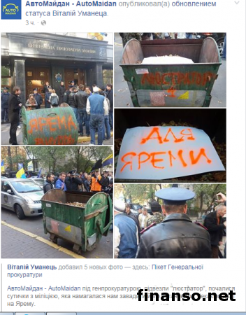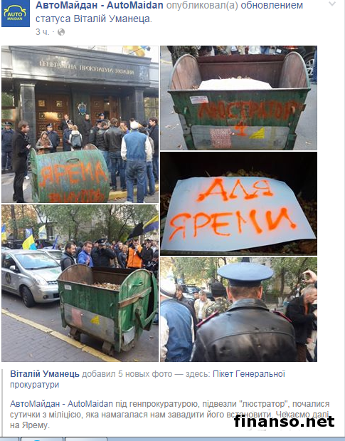 Как передают корреспонденты издания «Украина сегодня: Finanso.net», на страничке сообщества в Facebook написано: «Автомайдан под Генпрокуратурой. Начались столкновения с милицией, которая пыталась помешать нам установить привезенный нами «люстратор». Ждем дальше Ярему». Как выяснилось, активисты требовали встречи с представителем Генеральной прокуратуры, который сможет дать объяснения, почему до сих пор не понесли наказание фальсифицирующие уголовные дела против «автомайдановцев» во время Евромайдана в Киеве работники Госавтоинспекции. В это же время активисты отмечают: «Представитель прокуратуры, работа которой состоит в приеме обращений, вышел к нам, наконец, только через час после начала акции. Нам тут же предложили зайти к ним в кабинеты в составе нескольких человек и «переговорить». Однако мы требуем, чтобы представители власти вышли к общественности на улицу, к тем людям, благодаря которым Ярема и Ко и стали чиновниками». Автомайдан направится домой к Яреме.Помимо прочего, в сообщении на страничке сообщества в соцсети подчеркивается: «К ним на переговоры пошел наш представитель. А уже в пятницу Автомайдан поедет к Яреме домой, если он сейчас не выйдет из Генпрокуратуры к нам на улицу или если его заместитель не объяснит бездействие прокуратуры». В свою очередь активист Виталий Уманец в своем аккаунте в «Фейсбук» отмечает: «Прошло семь месяцев с того момента, как были открыты уголовные дела в отношении работников Госавтоинспекции, которые фальсифицировали дела против «автомайдановцев» прошедшей зимой, однако за это время «никто из лиц, виновных в преследовании водителей за поездки в Межигорье, так и не понес наказание». При этом Уманец подчеркнул: «Большинство гаишников продолжают работать, судей вообще никто не трогал. Организаторы не установлены. Уголовные дела закрываются». Также активист сообщил, что на входе в здание Генеральной прокуратуры собравшиеся активисты раздают чиновникам памперсы, чтобы их передали главе ГПУ или его заместителю, которые уже больше 2 часов не могут выйти к «автомайдановцам». |