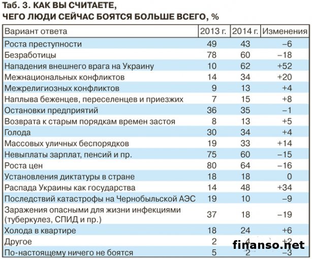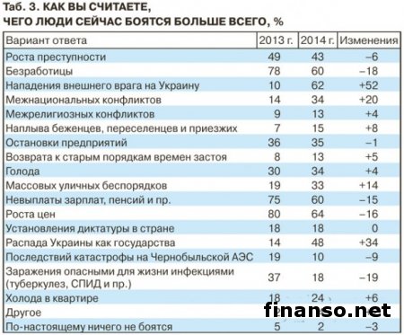 У человека может быть целый набор страхов. Кого-то преследует страх темноты, высоты или воды, кто-то боится боли, смерти или болезни, у кого-то возникает страх одиночества или, наоборот, страх общения. У большинства украинцев на первом месте самых актуальных страхов является страх нападения внешнего врага на страну.Как передают корреспонденты издания «Украина сегодня: Finanso.net», о таких результатах говорит Институт социологии НАНУ, который в июле-августе месяце нынешнего года провел соответствующее мониторинговое исследование. Известно, что в ходе исследования, которое проводилось во всех областях Украинского государства, кроме Крыма, было опрошено 1880 респондентов. В соответствии с предоставленными социологами данными, в минувшем году только 10 процентов украинцев испытывали страх от внешнего вторжения, но уже в нынешнем году эта цифра увеличилась до 62 процентов. Распад страны как государства находится на втором месте у украинцев (14 и 48 процентов соответственно) среди самых актуальных страхов. Страх возникновения межнациональных конфликтов находится на третьем месте у жителей Украины. В 2013 году за него высказались 14% опрошенных граждан, а в текущем – 34 процента. Другие страхи украинцев.Среди самых наибольших страхов украинского народа на четвертом месте располагается страх массовых уличных беспорядков. Сейчас о такой опасности заговорили 33 процента украинцев, хотя всего год назад эта цифра была почти в два раза меньше и составляла 19 процентов. Стоит отметить, что в это же время у украинского народа заметно уменьшились страхи перед ростом цен. Так как в минувшем году этого боялись 80 процентов украинцев, то в нынешнем – 64 процента. Страх перед невыплатой заработных плат также упал с 75 процентов в 2013 году до 60 процентов в нынешнем. Все меньше граждане Украины боятся остаться безработными - около 18 процентов. Опасными для жизни инфекциями, к примеру СПИДом и туберкулезом, боятся заразиться в два раза меньше украинцев – 19 процентов, чем в прошлом году. А вот страх перед тем, что в квартире будет холодно, вырос у украинцев с 18 до 24 процентов. Также в сравнении с прошлым годом у жителей Украины вырос страх остаться голодным – с 30 до 34 процентов. При этом практически каждый пятый (18 процентов) стабильно опасается того, чтобы в стране была установлена диктатура, а страх возвратиться к старым порядкам времен застоя вырос на пять процентов. Примечательно, что также уменьшился на три процента состав людей, которые вообще ничего не боятся. |