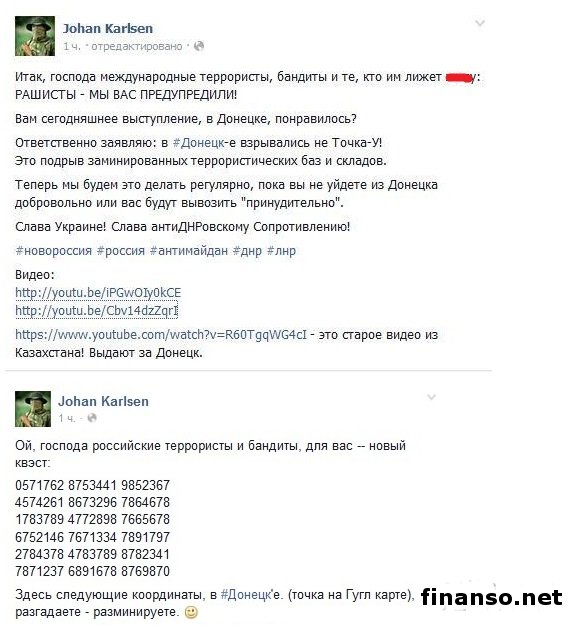 Ответственность за вчерашние взрывы в Донецке взял на себя некий Johan Karlsen, которые сообщил о том, что они – представители "АнтиДНРовского сопротивления" и будут продолжать совершать свои диверсии в Донецке, о чем пишет "