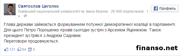 В данный час проходят консультации лидеров «Блока Петра Порошенко» с представителями «Народного фронта» по поводу создания будущей парламентской коалиции. Такую информацию обнародовали в пресс-службе политической партии, возглавляемой Арсением Яценюком, о чем пишет УНИАН. Как выяснили корреспонденты издания «Украина сегодня: Finanso.net», в свою очередь пресс-секретарь Президента Украины Петра Порошенко Святослав Цеголко на своей странице в социальной сети Facebook также подтвердил эту информацию, написав: «Глава государства занимается формированием мощной демократической коалиции в Верховной Раде Украины. Для этого Петр Порошенко провел сегодня встречу с Арсением Яценюком. Также президент встретился с Андреем Садовым. Переговоры продолжаются». Кроме того, в ходе пресс-конференции экс-замглавы СНБО седьмой номер в списке «Народного фронта» Виктория Сюмар также сообщила, что в эту минуту продолжаются переговоры «Блока Петра Порошенко» и «Народного фронта» о парламентской коалиции. Сюмар отметила: «Блок Петра Порошенко» и «Народный фронт» набирают совместно порядка 43 процентов, и для нас это является сигналом того, что общество хочет единства власти и не хочет каких-либо ссор формата властных партий». «Поскольку выборы проходили по старой пропорционально-мажоритарной системе, то парламент не полностью соответствует волеизъявлению людей», - подытожила политик. Проект коалиционного соглашения.Напомним, ранее издание, ссылаясь на заявление Юрия Луценко, сообщало, что сегодня будет обнародован проект коалиционного соглашения. Так, по словам Луценко «на протяжении сегодняшнего дня проект коалиционного соглашения, которое мы предлагаем нашим партнерам, будет обнародован». Также он отметил: «Проект будет содержать, в основном, календарный график законодательных инициатив, которые должны поддерживаться парламентским большинством и сокращенный вариант президентской программы «Стратегия-2020». Также стоит напомнить, что согласно словам Юрия Луценко, «Блок Петра Порошенко» предложил приобщиться к переговорам по созданию коалиции руководителям политических партий «Батькивщина», «Свобода», «Народный фронт» и «Самопомощь». А вот Радикальная партия Олега Ляшко и «Оппозиционный блок» в коалицию входить не будут. |