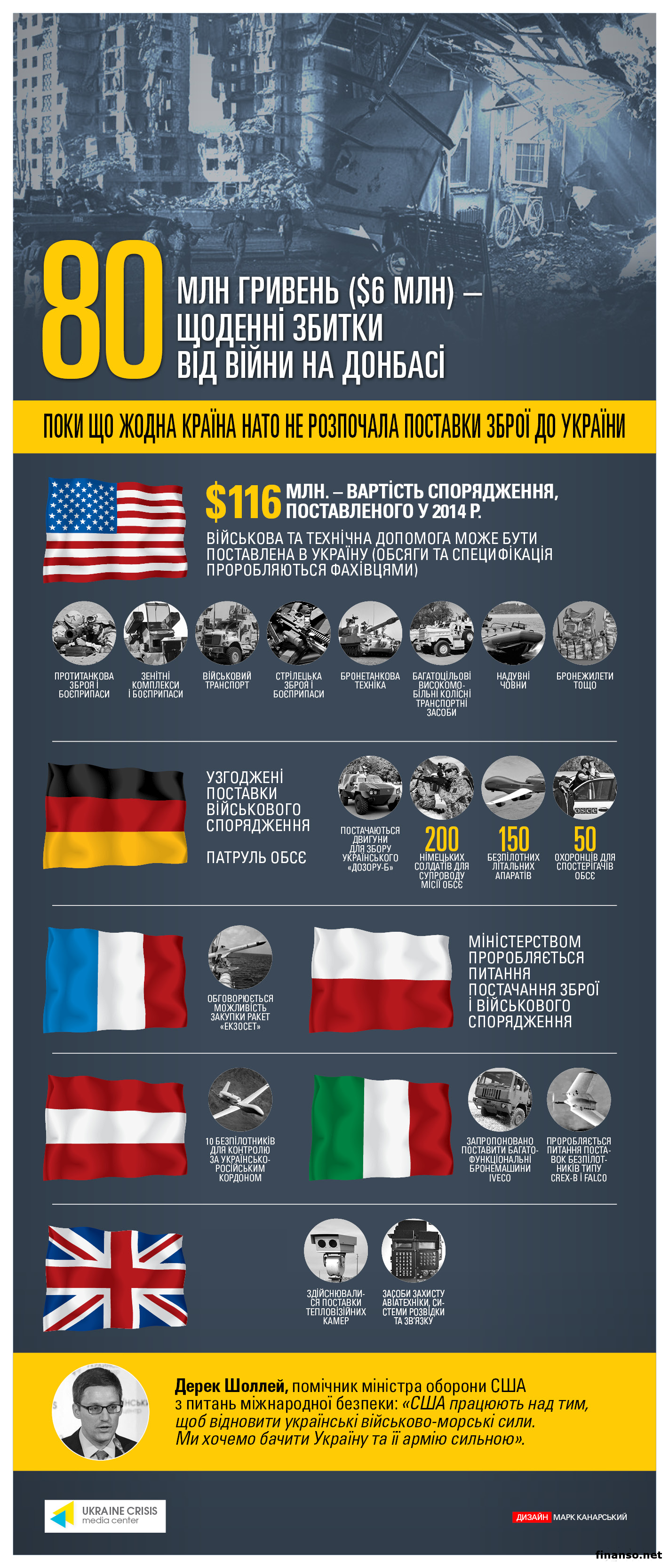 Он отметил, что причиной для отказа стала высокая стоимость эксплуатации дорогой техники, а также длительное время, которое необходимо для того, чтобы переучить пилотов для работы с новой техникой. Напомним, что ранее президент Украины Петр Порошенко сообщал о том, что он согласен с западными партнерами относительно вопросов предоставления для Украины образцов летального оружия. В настоящее время ни одна из стран не подтвердила возможности таких поставок и закупка летального оружия все еще невозможна. Через некоторое время появилась информация относительно того, что Соединенные Штаты Америки поставили на территорию Украины радарные системы, которые предназначены для борьбы с минометами противника. Данный тип вооружения будет использоваться в зоне АТО. Какую помощь может получить Украина?Напомним, что ранее представители украинского кризисного центра подготовили инфографику относительно того, какую военную помощь могут предоставить Украине страны мирового сообщества. При этом в настоящее время продолжается сохраняться возможность того, что Украине будет передано летальное оружие, поставки которого во время саммита НАТО анонсировал президент Украины Петр Порошенко. Наибольшим донором вооружений, по официальной информации стран-членов НАТО, будут являться Соединенные Штаты Америки. В США уже дали гарантии относительно безоплатного предоставления Украине снаряжения на общую сумму в 116 миллионов долларов. Сюда будут входить шлемы, бронежилеты, транспорт, ПНВ, тепловизоры, рации, спецтехника, патрульные катера, радары, палатки, и другое снаряжение. Кроме того, имеется возможность поставок и других товаров, в частности противотанкового оружия, зенитных комплексов, военного транспорта и бронетанковой техники. Среди стран, которые будут производить поставки на территорию Украины, также есть Польша и Франция. |