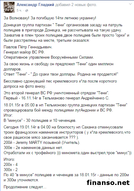 Как удалось выяснить корреспондентам издания «Украина сегодня: Finanso.net», в ходе спланированной операции украинские патриоты захватили в плен патруль так нызваемых полицейских самопровозглашенной, непризнанной мировым сообществом Донецкой народной республики. В сообщении бойца АТО говорится: «За Волноваху, за погибшую 14-летнюю украинку! Группа партизан «Тени» из Донецка, организовав засаду на патруль полицейских в пригороде Донецка, никак не рассчитывала на такую удачу». Также в сообщении отмечается: «Из троих захваченных в плен полицейских двое оказались просто «орками», в результате чего были расстреляны на месте. Третьим же оказался генерал-майор Вооруженных сил Российской Федерации Павлов Петр Геннадиевич. Оперативное управление ВС РФ». Генерал предлагал 1 миллион долларов США за свою «шкуру».Примечательно, что группа партизан «Тени» сообщила и о том, что российский генерал предлагал им за свое спасение миллион долларов США. Так, украинские партизаны добавили: «За свою свободу и жизнь он предложил группе партизан «Тени» миллион американских долларов. Однако патриоты дали достойный ответ: «До одного места твои доллары. Родину продать нельзя!». Также боец АТО сообщил, что «18 января 2015 года в 5 часов утра в населенном пункте Тельманово группа партизан из Донецка «Тени» спровоцировала бой между полицаями Луганской народной республики и Вооруженными силами Российской Федерации. В результате такого поворота событий «в минусе» оказались 10 чеченцев и 30 полицаев. На следующий день, 19 января, в 4 часа утра на блокпосту населенного пункта Саханка отминусовали троих французских наемников-инструкторов: 300-е - двое наемников, 200-й - Jeremy MARTY, позывной Учитель. Их отработали с трофейного миномета: произвели один выстрел – трое «в минусе». Александр Гладкий подытожил: «Итог: по 40 «в минусе» полицаев и чеченцев за 18 января 2015 года, 200-х – 4, 300-х – 2, данные уточняются. Далее будет». |