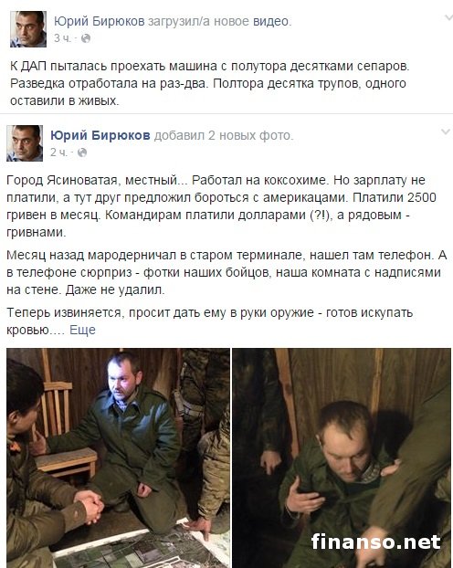На своей странице в социальной сети Facebook советник Президента Украины Петра Порошенко Юрий Бирюков сообщил, что в четверг, 22 января 2015 года, в районе аэропорта Донецка украинская разведка уничтожила машину с 15 пророссийскими террористами.