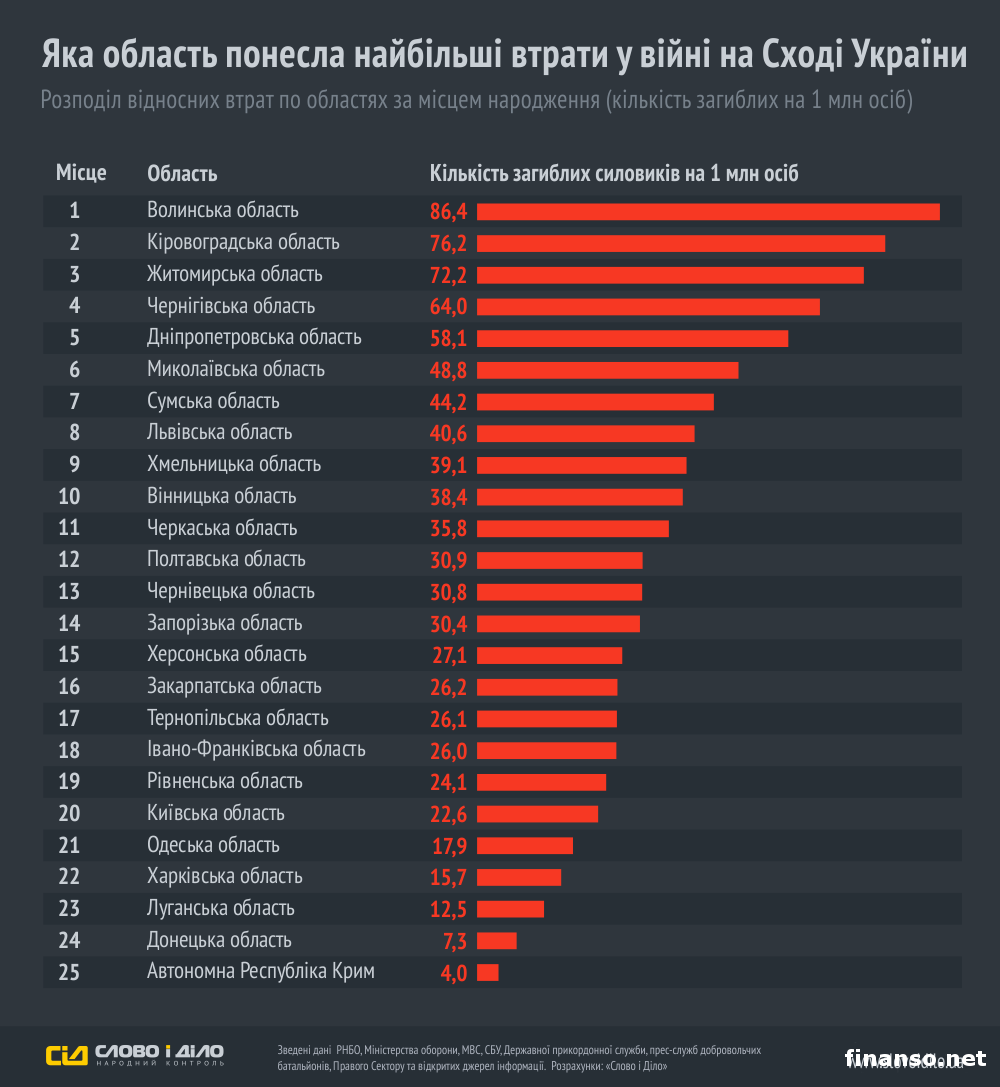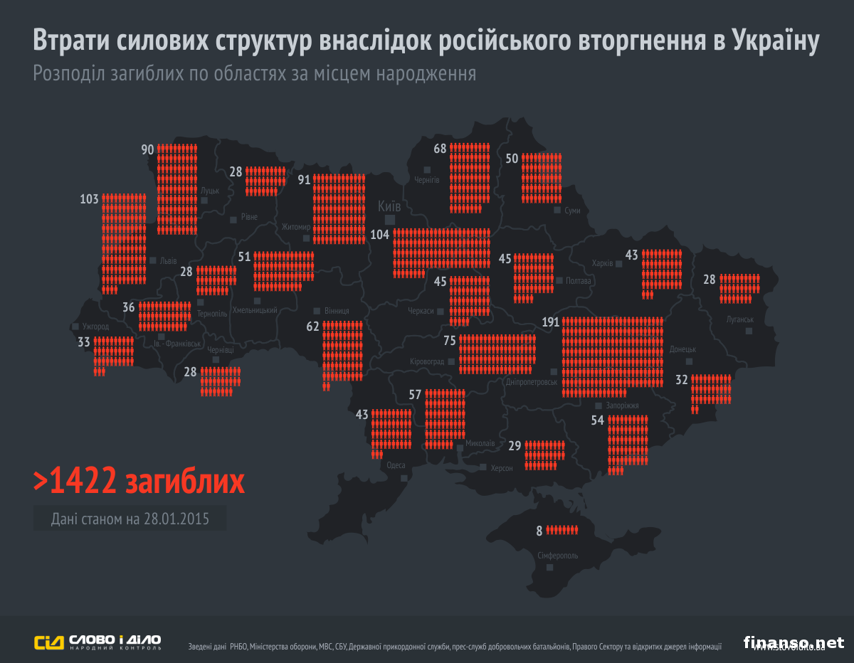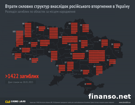 В зоне проведения антитеррористической операции на востоке Украины погибло уже 1422 военнослужащих. Такую статистику обнародовали представители портала "Слово и дело", собрав данные СНБО, СБУ, Министерства обороны Украины, Государственной пограничной службы и пресс-служб добровольческих батальонов, "Правого сектора" и ряда открытых источников информации по состоянию на 28 января текущего года. Об этом пишет "Украина сегодня: Finanso.net".Представители издания структурировали данную информацию и распределили потери по областям. При этом неизвестно, учитывались ли данные о бойцах, которые умерли в медицинских учреждениях Украины. Отметим, что 6 декабря президент Украины Петр Порошенко рассказал о том, что за время конфликта на территории восточных регионов Украины погибло 1252 украинских военнослужащих. Данные по солдатам РФ.Во вторник, 6 января 2015 года, во время проведения пресс-конференции в Киеве правозащитница и руководитель сообщества "Груз-200 из Украины в Россию" Елена Васильева рассказала о том, что в результате боевых действий на территории Луганской и Донецкой областей погибло больше 5,5 тысячи российских военных. Отметим, что Елена Васильева сказала: "По имеющейся у нас информации, в настоящее время в результате боевых действий на территории восточных регионов Украины погибло уже больше 5,5 тысячи граждан Российской Федерации". Она добавила, что такое число погибших является тем количеством, которое установили только представители ее организации, но реальное количество погибших, в том числе в результате взрывов, может быть значительно больше. В то же время она сообщила о том, что имеется большое число людей, граждан Российской Федерации, которые пропали без вести. Правозащитница также сообщила о том, что российские военнослужащие все время упрекают в том, что Васильева занижает цифры погибших. Поскольку даже в том случае, если назвать цифру в 7,5 тысячи погибших солдат, то это будет все равно меньше, чем реальные потери российской армии за время войны на Донбассе. |