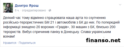 Как выяснили корреспонденты издания «Украина сегодня: Finanso.net», Ярош отметил, что в результате удара погибло порядка двухсот террористов. Подробности операции.В это же время лидер «Правого сектора» на своей странице в социальной сети Facebook сообщил: «Артиллерия Вооруженных сил Украины несколько часов тому назад отлично сработала по скоплению российско-террористических БМ 21 «Град» и автомобилям с боекомплектами к ним. В соответствии с предварительной информацией, в результате успешно проведенной операции было уничтожено двадцать вражеских «Градов» и тридцать машин с боекомплектами к ним, а также порядка двухсот боевиков. Мощные взрывы в Донецке вызвали панику». Сообщим также, что взрыв был такой силы, что в небе над Донецком образовался огненный «гриб», а волна звука добралась до Горловки, где население почувствовало мощные вибрации. Жители Донецка после взрыва сообщают: «Мой девятиэтажный дом затрясло, как картонный. Двери, стены, посуда – все задрожало. Даже из крана сама вода потекла! Будто при землетрясении. Взорвалось что-то очень мощное. Такое последний раз было в октябре 2014-го, когда в домах по всему центру вылетели стекла в окнах». Множество местных жителей в момент взрыва наблюдали огромную вспышку над городом. Еще один из местных жителей отметил: «Примерно в районе железнодорожного вокзала был виден огненный «гриб». Говорят, что взорвался склад с боеприпасами». Кроме того, мощнейший взрыв, прогремевший в столице Донбасса, был слышен и в соседних городах, в том числе в Авдеевке и Макеевке. Напомним, ранее издание, ссылаясь на сообщение журналиста и блогера Сергея Иванова, сообщало, что украинская артиллерия накрыла крупную базу боевиков в районе села Желобок, которое располагается в стороне от Бахмутской трассы в Луганской области. Так, журналист в своем «Фейсбуке» написал: «В районе многострадального Желобка наша артиллерия накрыла около двух тысяч боевиков. Я сам прозрел. Но два очень близких человека, которые сейчас находятся там, подтвердили эту информацию». |