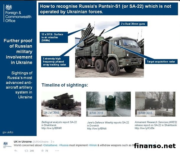Как удалось выяснить корреспондентам издания «Украина сегодня: Finanso.net», посольство Великобритании в социальной сети Twitter опубликовало схему под таким названием: «Как распознать российский «Панцирь-С1» (или SA-22), которого нет на вооружении в Украине». В это же время в британском ведомстве отметили: «Мир обеспокоен в результате происходящей в Дебальцево ситуации. Российская Федерация должна выполнить соглашения, достигнутые в ходе встречи в формате «нормандской четверки» в Минске и вывести оружие из Украины». Кроме того сообщается, что российские «Панцири» были зафиксированы в Донецке, а также в Шахтерске. Как добавляют британцы, такого оружия на вооружении украинской армии нет. Характеристика «Панцирь-С1».Как известно, «Панцирь-С1» или SA-22 Greyhound – это российский самоходный зенитный ракетно-пушечный комплекс наземного базирования. Сообщим, что предназначен он для ближнего прикрытия военных и гражданских объектов, в частности комплексов ПВО большой дальности. Кроме того, «Панцирь» может осуществлять защиту обороняемого объекта от наземных и надводных угроз. Напомним, ранее сегодня издание «Украина сегодня: Finanso.net», ссылаясь на информацию, опубликованную на сайте пресс-центра Совета национальной безопасности и обороны Украины, сообщало, что российско-террористические войска, несмотря на оглашенное в соответствии с Минскими договоренностями перемирие, активно продолжают нарушать режим прекращения огня на Донбассе, обстреливая и штурмуя позиции украинских военных. Также ранее сообщалось, что в свою очередь на своей странице в социальной сети Facebook командир добровольческого батальона Семен Семенченко написал, что танки российских наемников расстреляли колонну украинских военнослужащих, которые выходили из Дебальцево. В это же время Семенченко сообщил, что украинская артиллерия дала ответный удар по танкам врага. |