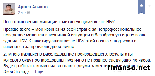 Кроме того, Аваков сообщил, что в результате произошедшего он незамедлительно принял решение об увольнении руководителя Печерского районного отделения милиции Киева, его заместителя по общественной безопасности с занимаемой должности. Примечательно, что сделал это глава МВД до выводов комиссии по расследованию. Сообщение Авакова.Как удалось выяснить корреспондентам издания «Украина сегодня: Finanso.net», в своем «Фейсбуке» Аваков написал: «В первую очередь приношу свои извинения всему государству за непрофессиональное поведение милиции в возникшей ситуации и безобразную сцену у здания Национального банка Украины. К митингующим возле Нацбанка в эту ночь я лично подъехал и извинился за произошедшее. Я назначил расследование по поводу произошедшего инцидента. Результаты следствия будут обнародованы не позднее следующих 48 часов. Работу будет осуществлять комиссия во главе с двумя заместителями главы МВД - Сергеем Яровым и Какой Згуладзе». Сообщим также, что этой ночью по факту разговора с пикетчиками под зданием Национального банка Украины была согласована договоренность о предоставлении всех фото- и видеоматериалов со стороны протестующих для проведения объективного следствия. Аваков написал: «По факту моего разговора этой ночью с митингующими под Нацбанком - договорились о предоставлении всех фото- и видеоматериалов со стороны пикетчиков для материалов объективного расследования». В это же время глава Министерства внутренних дел Украины Арсенк Аваков сообщил, что «по факту столкновения было возбуждено уголовное дело». Стоит напомнить, что в четверг вечером, 26 февраля текущего года, под зданием Национального банка Украины возникла толкотня активистов «Финансового Майдана» с правоохранительными органами. Согласно свидетельствам очевидцев, сотрудники милиции пытались снести бульдозером палатку активистов. В результате такого поворота событий четыре человека получили травмы, впоследствии чего они были направлены в травматологические отделения медицинских учреждений украинской столицы. |