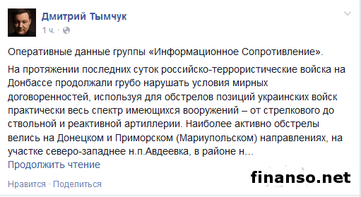 Народный депутат Верховной Рады Украины, координатор группы «Информационное сопротивление» Дмитрий Тымчук на своей странице в социальной сети Facebook сообщил, что за последние двое суток были зафиксированы факты переброски из территории Российской Федерации в Украину пяти конвоев снабжения для российско-террористических войск.