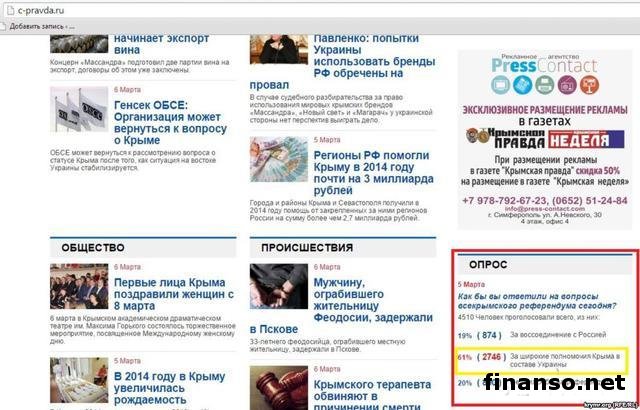 Как удалось выяснить корреспондентам издания «Украина сегодня: Finanso.net», 5 марта 2015 года на сайте был опубликован опрос «Как бы вы ответили на вопросы всекрымского референдума сегодня?». По состоянию на 8 часов 00 минут 9 марта участие в нем приняли 4510 человек. За то, чтобы Крым вернулся в состав Украины, проголосовал 61 процент респондентов, за присоединение к России отдали свои голоса 19 процентов, еще 20% «не явились бы на референдум». В общем, среди предложенных вариантов ответа значатся: «присоединение к России», «пребывание Крыма в составе Украины при условии предоставления более широких полномочий» и «неявка на референдум». Опубликован опрос 5 марта текущего года. Примечательно, что по состоянию на нынешнее утро результат явно не такой, как хотели бы организаторы опроса. Сообщим, что по состоянию на 12 часов 40 минут сегодняшнего дня сайт «Крымская правда» прекратил свою работу. Незаконная аннексия Крыма.Напомним, переброшенные из Российской Федерации и с крымских баз Черноморского флота России в начале марта месяца 2014 года войска, не имеющие опознавательных знаков, незаконно оккупировали полуостров Крым. Немного позже после этого, а именно 16 марта того же года, на территории Автономной Республики Крым и города Севастополя прошел псевдореферендум о статусе полуострова. По результатам так называемого референдума Российская Федерация включила украинский Крым в состав России. Отметим, что как тогда, так и по настоящее время ни Украина, ни Соединенные Штаты Америки, ни Европейский союз не признали данное голосование и считают, что РФ просто аннексировала полуостров. В результате такого поворота событий Европейский союз и Соединенные Штаты Америки ввели целый ряд санкций в отношении Российской Федерации. В настоящее время Запад активно продолжает настаивать на том, что Крым – это неотъемлемая часть Украины. |
