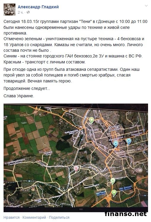 Украинский партизанский отряд «Тени» в Донецке нейтрализовал принадлежащие террористам грузовики, бензовозы и две зенитные установки. Получается, что взрывы, произошедшие в городе Донецк вчера, 18 марта, - это разрушительная акция против боевиков. Такую информацию разместил сегодня на своей странице в Facebook руководитель партизанского отряда Александр Гладкий. Своим читателям новость сообщают корреспонденты издания «Украина сегодня: Finanso.net». «18 марта 2015 года группами партизан «Тени» в городе Донецке с десяти до одиннадцати часов утра было произведено нанесение одновременных ударов по технике врага, а также по личному составу противника.