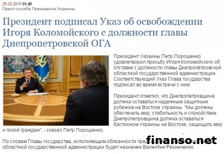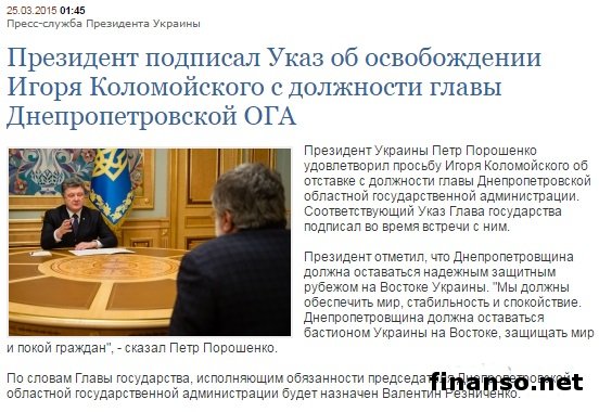 Стало известно, что с поста председателя Днепропетровской областной государственной администрации был уволен Игорь Коломойский. Такую информацию в своем Twitter сообщил пресс-секретарь президента Украины Петра Порошенко Святослав Цеголко. Как удалось выяснить корреспондентам издания «Украина сегодня: Finanso.net», в сообщении Цеголко говорится: «Президент подписал Закон «О внесении изменений в Закон «Об акционерных обществах» и таким образом удовлетворил просьбу об отставке с поста главы Днепропетровской ОГА Игоря Коломойского». В отставку также подал и Геннадий Корбан.В свою очередь на личной странице в социальной сети Facebook народный депутат Украины Борис Филатов добавил, что заместитель председателя Днепропетровской областной государственной администрации Геннадий Корбан тоже подал в отставку. На сайте главы Украинского государства отмечается, что Президент Украины Петр Порошенко подписал указ об отставке во время встречи с Коломойским. Известно также, что пока исполняющим обязанности председателя Днепропетровской областной государственной администрации назначен Валентин Резниченко. Валентин Резниченко назначен и. о. главы Днепропетровской ОГА.Сообщим, что ранее Валентин Резниченко возглавлял «Украинский медиа холдинг», когда он принадлежал Борису Ложкину, занимающему в настоящее время пост главы Администрации президента. На протяжении одного месяца Резниченко являлся главой Запорожской областной государственной администрации. Примечательно, что комментируя указ об увольнении Игоря Коломойского, Президент Украины Петр Порошенко сказал, что в настоящее время Днепропетровская область остается надежным рубежом защиты. Это восточный бастион, защищающий мир и спокойствие украинских граждан. Напомним, ранее уже сообщалось, что Игорь Коломойский никак не мог смириться с потерей контроля над госпредприятиями, в результате чего он сначала свез вооруженную охрану под «Укртранснафтогаз», а немного позже и под «Укрнафту». На протяжении последних нескольких дней Коломойский успел оскорбить журналиста «Радио Свободы», за что получил выговор от Петра Порошенко, а также удостоился в достаточно жесткой форме пообщаться с парламентарием Мустафой Найемом. |