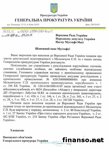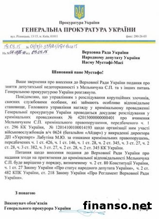 Как удалось выяснить корреспондентам издания «Украина сегодня: Finanso.net», в ответе из Генеральной прокуратуры Украины Мустафе Найему говорится: «Управление Генпрокуратуры по расследованию коррупционных преступлений, совершенных служебными лицами, которые занимают особо ответственное положение, осуществляет досудебное расследование». Решается вопрос о снятии депутатской неприкосновенности.В настоящее время решается вопрос о привлечении народного депутата ВРУ Сергея Мельничука к уголовной ответственности и снятии с бывшего командира добровольческого батальона «Айдар» депутатской неприкосновенности. Такая информация обнародована в документе на странице Мустафы Найема в соцсети «Фейсбук». При этом парламентарий Мустафа Найем добавил: «В день, когда перебежчик Сергей Мельничук перешел из фракции РПЛ в группу Игоря Еремеева, я говорил, что в отношении бывшего комбата уже давно открыто уголовное производство, а также готовится представление о снятии с него депутатской неприкосновенности. Тогда мне никто не поверил. Сегодня же я получил официальный ответ из Генеральной прокуратуры. Так, парламентарий Сергей Мельничук подозревается в привлечении бойцов добровольческого батальона «Айдар» к похищению директора ГП «Укрспирт» Михаила Лабутина. Решается вопрос о снятии депутатской неприкосновенности и привлечении к уголовной ответственности». Напомним, ранее, 19 декабря 2014 года, сообщалось, что Михаил Лабутин, являющийся генеральным директором ГП «Укрспирт», был похищен из больницы неизвестными вооруженными людьми. Тогда пресс-служба «Укрспирта» сообщила, что охранявшие генерального директора госпредприятия «Укрспирт» Михаила Лабутина в больнице представители батальона «Айдар» по просьбе сотрудников профсоюза ГП вывезли его в безопасное место «в связи с информацией о планах покушения». А уже в январе месяце текущего года налоговая милиция Киевской области объявила Михаила Лабутина, экс-гендиректора «Укрспирта» в розыск. |