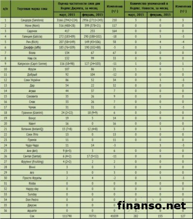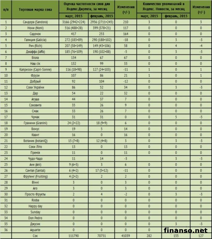 Натуральный сок - полезный, вкусный продукт, известный во всех уголках земного шара. Рост украинского рынка соков идет быстрыми темпами, ведя к насыщению, появлению новых ТМ. Как не растеряться в изобилии представленного ассортимента, как купить то, что нужно, по выгодной цене? Какая ТМ пользуется популярностью у жителей Украины? Именно такими вопросом задались специалисты издания "Украина сегодня: Finanso.net".Рейтинг известности ТМ соков за март 2015 года. За счет популярного сервиса Яндекс.Директ специалисты известного аналитического журнала "Биржевой лидер" четко определили известные ТМ соков через систему поиска Яндекс. Анализ был проведен на основе использования данных: - сервиса "Подбор слов" (wordstat.yandex.ru) для точного определения общего количества упоминаний за последние 30 дней; - региона поиска – Украина. Таким образом, полученные результаты дают возможность говорить о том, что в числе лидеров в марте 2015 года оказались следующие торговые марки соков: 1. Первое место по известности занимает по праву марка соков "Сандора". Именно по ней было произведено максимальное число запросов в системе Яндекс за последний месяц - 3 166 запросов. Данным названием презентуется целая линейка наименований из 1 морса и 17 вкусов сока. 2. Второе место в марте заслуженно получила марка соков "Нони", у нее за месяц зафиксировано 516 запросов в системе поиска Яндекс. Это сок исключительно традиционных рецептур, который делается из овощей и фруктов, выращенных по большей части на территории Украины. 3. Третье место отдано на этот раз торговой марке "Садочок". По этому названию за последний месяц активные украинские пользователи Сети успели произвести 417 запросов. "Садочок" - сок достаточно высокого качества, его получают преимущественно из фруктов, овощей, выросших в Украине. Сок этой марки выпускается в асептичной упаковке разных объемов, а также в ПЭТ-бутылках. Далее следуют такие марки соков: - Galicia – 272 запроса в Яндексе за месяц; - Rich – 207 запросов в Яндексе за месяц; - Jaffa – 185 запросов в Яндексе за месяц; - Біола – 134 запроса в Яндексе за месяц; - Наш сік – 132 запроса в Яндексе за месяц; - Capri-Sonne – 116 запросов в Яндексе за месяц; - Фрузи – 107 запросов в Яндексе за месяц; - Добрый – 92 запроса в Яндексе за месяц; - Соки України – 86 запросов в Яндексе за месяц; - Дар – 54 запроса в Яндексе за месяц; - Агуша – 44 запроса в Яндексе за месяц; - Соковита – 35 запросов в Яндексе за месяц; - Смак – 33 запроса в Яндексе за месяц; - Чумак – 31 запрос в Яндексе за месяц; - Granini – 24 запроса в Яндексе за месяц; - Бонус – 19 запросов в Яндексе за месяц; - Квант – 16 запросов в Яндексе за месяц; - botaniQ – 15 запросов в Яндексе за месяц; - Соки Літо – 13 запросов в Яндексе за месяц; - Премія – 11 запросов в Яндексе за месяц; - Чудо-Чадо – 11 запросов в Яндексе за месяц. |
