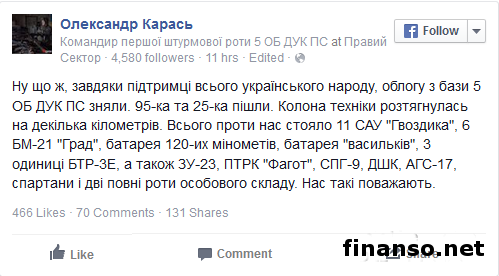 Как удалось выяснить корреспондентам издания «Украина сегодня: Finanso.net», на своей странице в соцсети Карась написал: «Ну что же, благодаря поддержке всего украинского народа, осаду с базы 5 ОБ Добровольческого украинского корпуса «Правый сектор» сняли. 25-ка и 95-ка ушли. Колонна техники растянулась на несколько километров». Подробности окружения базы ПС.В соответствии со словами командира первой штурмовой роты «Правого сектора» Александра Карася, против добровольцев «Правого сектора» стояли шесть «Градов», одиннадцать артиллерийских установок «Гвоздика», батарея «Васильков», батарея 120-мм минометов, две роты личного состава, а также много другой техники. Насколько известно, сообщение о том, что база «Правого сектора» была заблокирована бойцами ВСУ, появилось во вторник вечером. Естественно, это возмутило бойцов ДУК ПС, и они вышли на акцию протеста под стенами Администрации президента. В свою очередь, в Генеральном штабе Вооруженных сил Украины пояснили, что разоружать ПС не планируют, а блокпосты установлены исключительно на период военных учений до 2 мая текущего года. В свою очередь, в результате такого поворота событий лидер «Правого сектора» Дмитрий Ярош заявлял, что политическое и военное руководство хочет спровоцировать конфликт между «Правым сектором» и бойцами Вооруженных сил Украины, чтобы таким образом дискредитировать добровольческие отряды. Также напомним, что представитель АПУ по АТО Александр Мотузяник подчеркивал, что Вооруженные силы Украины отойдут от базы Добровольческого украинского корпуса «ПС» на Днепропетровщине после окончания учений высокомобильных десантных войск. Согласно его словам, о разоружении ДУК «ПС» речи не было, ведь проходили переговоры только о легализации добровольного формирования как отдельного подразделения в составе ВСУ. |