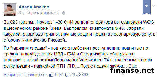 Причастные к нападению на автозаправочную станцию в Киеве преступники ограбили оператора автозаправки WOG на 823 гривны и застрелили двух сотрудников милиции. Как передают корреспонденты издания «Украина сегодня: Finanso.net», глава Министерства внутренних дел сообщил об этом на своей странице в социальной сети «Фейсбук». Убийство за 823 гривны.Так, Аваков написал: «За 823 гривны в 01 час 30 минут ночи 4 мая текущего года преступники ранили оператора автозаправочной станции в Деснянском районе столицы из автомата калибра 5,45 миллиметра. Забрали кассу, личные вещи работника АЗС и пошли в лесопарковую зону, в сторону жилого массива Лесной». В это же время Арсен Аваков добавил, что «патрульные наряды милиции, продолжившие преследование преступников, задержали транспортное средство злоумышленников. Во время задержания в правоохранителей было брошено две гранаты, а также завязалась перестрелка. После этого двое из преступников скрылись из салона транспортного средства, а еще один был задержан с огнестрельным ранением головы, в результате чего позже скончался». Глава МВД Украины подчеркнул, что в ходе осмотра транспортного средства преступников было обнаружено два автомата и четыре магазина с патронами 5,45 к ним, две гранаты, нагрудные нашивки с надписью «УПА» и «Спецподразделение «Торнадо», а также множество телефонных карточек разных операторов и лист бумаги с планом перемещения. Примечательно, что, по словам Арсена Авакова, «оперативным путем были установлены трое – 91, 95 и 98 годов рождения. Они сдались после того, как правоохранители окружили их в квартире. В жилом помещении были обнаружены гранатомет РПГ-26, шашки, гранаты и прочее оружие. Злоумышленники сознались, что позавчера, 2 мая 2015 года, они же обстреляли и пост ГАИ в Быковне». Напоследок глава МВД резюмировал: «С этими паразитирующими на военных ситуациях блуждающими шатунами будем кончать без церемоний! Жестко». |
