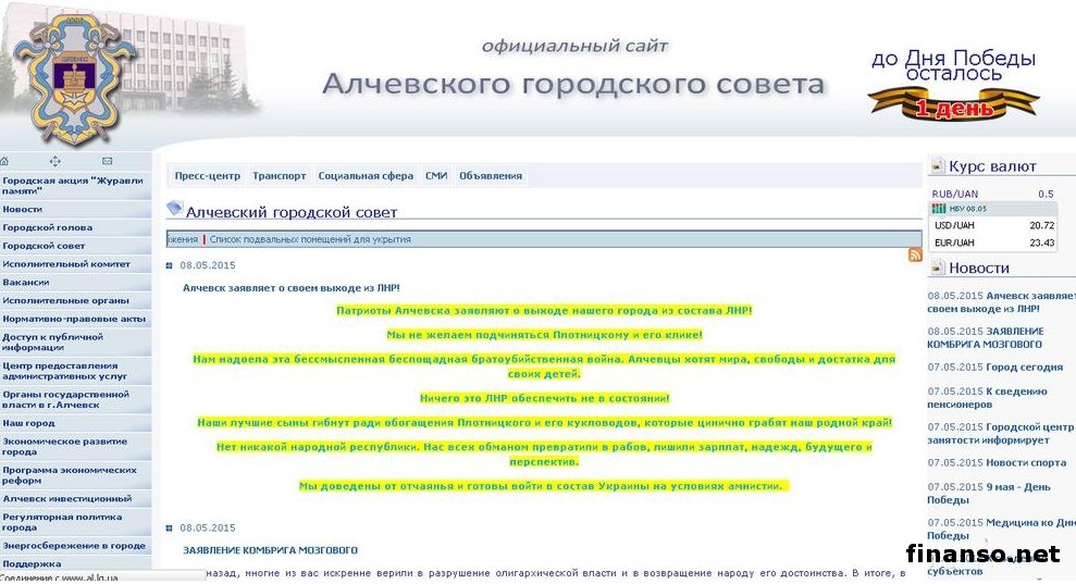 Как удалось выяснить корреспондентам издания «Украина сегодня: Finanso.net», город Алчевск якобы готов войти в состав Украинского государства на условиях амнистии. Так, на сайте Алчевского городского совета появилось сообщение о выходе города из состава «Луганской народной республики», после чего сайт перестал работать. Такую информацию в «Твиттере» сообщает издание Lugansk News Today. Издание сообщает, что «после появления на сайте Алчевского городского совета сообщения о выходе из Луганской народной республики, его пытаются «задосить» (за-DDoS-ить)». В самом сообщении от имени патриотов говорится, что «жители Алчевска хотят свободы, мира, а также достатка для своих детей. Однако «руководство» Луганской народной республики не в состоянии ничего из этого им предоставить». В заявлении также говорится, «мы доведены до отчаяния и готовы войти в состав Украинского государства на условиях амнистии». В настоящее время пока еще неизвестно кто именно разместил такое заявление на сайте городского совета Алчевска. Командует «парадом» в Алчевске Мозговой.Насколько известно, в настоящее время Алчевск находится на временно оккупированной российско-террористическими войсками части территории украинского Донбасса. Сообщим, что город находится под контролем группировки главы бандитского формирования Алексея Мозгового «Призрак». Напомним, ранее сегодня в средствах массовой информации появились данные о том, что на своей странице в социальной сети Алексей Мозговой, являющийся командиром батальона «Призрак», входящего в террористическую Луганскую народную республику, написал, что его обещали расстрелять в том случае, если он не отменит в Алчевске проведение парада ко Дню победы. Парад все же ему пришлось отменить, однако при этом он призвал единомышленников сплотиться, поскольку в настоящее время в ЛНР нет никакой власти. |