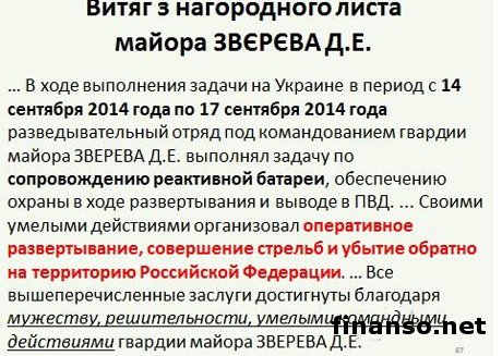 По заявлению на сегодняшнем брифинге для прессы руководителя информдепартамента контрразведки СБУ Виталия Найды, украинская Служба безопасности обвиняет Главное разведуправление Генштаба РФ в обстрелах украинских населенных пунктов из реактивных систем залпового огня «Град». Об этом пишут корреспонденты издания «Украина сегодня: Finanso.net».При этом глава департамента продемонстрировал присутствующим выписки из наградных листов российских спецназовцев на награждение медалью «За заслуги перед Отечеством» Евгения Зверева и медалью Суворова Тимура Джанисбаева. Согласно этим документам, российские военные были награждены «За заслуги перед Отчизной», за сопровождение реактивных систем залпового огня и своевременное выведение из после выполнения задания на территорию России. Спецназначенцы ГРУ ГШ РФ обеспечивают безопасность РСЗО, незаконно прибывающих в Украину из России.Найда сообщил, что фотокопии представленных документов были получены техническим способом, они являются подлинными. Спецназначенцы ГРУ ГШ, как вы видим, обеспечивают безопасность реактивных систем «Град» и «Ураганов», которые прибывают незаконно с территории РФ в зоны контроля боевиков с целью проведения боевых стрельб - как по военнослужащим сил АТО, так и по мирному населению. Руководитель департамента СБУ отметил, что на указанных документах стоят даты с 12 сентября по 26 сентября и с 14 сентября по 17 сентября 2014 г. Согласно имеющейся в контрразведке информации, известно, что в этот период целый ряд украинских населенных пунктов был обстрелян из реактивной артиллерии и не во всех этих населенных пунктах дислоцировались украинские войска. Найда заявил, что, таким образом спецподразделения ГРУ обеспечивают проведение боевых стрельб реактивной артиллерии по гражданскому населению страны, и мы обвиняем в этом ГРУ Генштаба России. Напомним, прессой сообщалось, что 20 мая российскими блогерами были опубликованы фотографии могил трех спецназовцев 16-й отдельной бригады спецназначения ГРУ ГШ МО РФ, погибших в Украине во время боев 4-5 мая 2015 г., предположительно в г. Золотое Луганской области либо селе Широкино Донецкой области. Напомним также, что президент Украины Петр Порошенко в своем интервью изданию ВВС заявил, что представители международных организаций могут лично убедиться, как представители армии РФ воевали в Украине, имея допуск к захваченным на украинском Донбассе российским спецназовцам. |