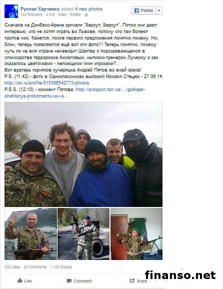 Как передают корреспонденты издания «Украина сегодня: Finanso.net», украинцы в социальных сетях бурно обсуждают фотографию голкипера донецкого «Шахтера» Андрея Пятова, на которой он запечатлен в обнимку с донецкими боевиками возле одного из блокпостов. Примечательно, что вратарь сборной Украины по футболу, в свою очередь, оправдывается, что не знал, с кем фотографируется. Сообщим, что на изображениях игрок донецкого «Шахтера» дружески обнимает пророссийски настроенных сепаратистов. Рядом с ним пользователи социальных сетей узнали донецкого боевика с фамилией Стецюк. Что ответил Пятов?Также вратарь «Шахтера» Пятов в свое оправдание добавил, что эта самая фотография была сделана больше чем год тому назад. В свою очередь телевизионная служба новостей (ТСН) процитировала слова футболиста таким образом: «В социальных сетях выложили фотографию, которой уже больше года, когда в Донецке еще ничего и не начиналось. Это был еще март прошлогодний, когда только строились блокпосты. Мы ехали на базу, нас остановили на блокпосту: «О, футболисты, можно с вами сфотографироваться?». Я не знал, кто эти люди». Отвечая на вопрос, не смутила ли Пятова георгиевская лента на груди рядом стоявшего мужчины, вратарь сборной Украины по футболу и клуба «Шахтер» из Донецка отметил: «Для меня все люди одинаковы. То, что политика - это одно. У нас в Донецке люди просто выходили и боролись за децентрализацию». Комментарии пользователей.Один из пользователей социальной сети «Фейсбук» Руслан Харченко прокомментировал появление этой фотографии такими словами: «Первоначально на «Донбасс-Арене» кричали «Беркут, Беркут». После этого они дают интервью, что не хотят играть во Львове, потому что там болеют против них. Кажется, после первого предложения понятно, почему. Но теперь появляются еще вот эти фото!!! Естественно, что теперь понятно, почему чуть ли не вся страна ненавидит «Шахтер» с подозревающимся в спонсорстве терроризма Ахметовым, нытиком-тренером Луческу и, как оказалось, цветочками - не поющими гимн игроками... Вот вратарь горняков, кучеряшка Андрей Пятов, во всей красе!». |