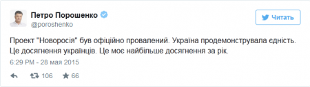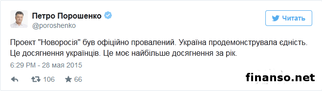 Как передают корреспонденты издания «Украина сегодня: Finanso.net», глава Украинского государства на своей странице в социальной сети «Твиттер» написал, что он считает, что за год своего президентства, провал проекта «Новороссия» является главным его достижением. В сообщении главы Украинского государства говорится: «Проект «Новороссия был официально провален. Украина продемонстрировала единство. Это достижение граждан Украины. Это самое большое мое достижение за год президентства». Россия признала крах проекта «Новороссия».Напомним, вчера, 28 мая 2015 года, Петр Порошенко в ходе своего интервью украинским телевизионным каналам заявил, что в Российской Федерации признали тот факт, что проект «Новороссия» не состоялся. Так, в своем заявлении глава Украинского государства заявил: «Задачей Российской Федерации было отнюдь не оккупировать Луганск и Донецк. Мы все прекрасно знаем, что ключевым планом, который стоял на первом этапе – это создание «Новороссии», девять областей Украины, а именно: Крым, Николаевская, Одесская, Запорожская, Херсонская, Донецкая, Луганская и Харьковская были отсечены…. На их территории должен был быть создан заповедник «Русского мира» - «Новороссия». Согласно словам президента Украины, до этого всего предполагался «протестный взрыв» во всех этих областях, введение туда российских войск через организацию провокаций и последующее уничтожение Украинского государства как независимой страны. Порошенко резюмировал: «В этом месяце было официально объявлено, что проект "Новороссия" потерпел крах. Он не состоялся». Путин отказался от проекта «Новороссия».Ранее издание «Украина сегодня: Finanso.net» ранее уже сообщало, что российский экономист Сергей Гуриев высказал мнение, что введенные Западом санкции против России, очень хорошо сделали свое дело, ведь российский президент Владимир Путин все-таки был вынужден отказаться от проекта «Новороссия». |