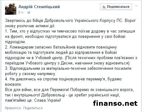 На своей странице в социальной сети «Фейсбук» командир ДУК «Правый сектор» Андрей Стемпицкий, в связи с активизацией российско-террористических войск на Донбассе, призвал всех бойцов ПС незамедлительно вернуться из отпусков и подготовиться к возвращению в зону проведения антитеррористической операции.