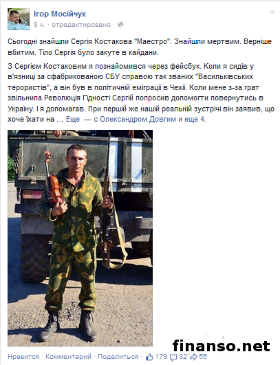 Как удалось выяснить корреспонденты издания «Украина сегодня: Finanso.net», народный депутат Украины отметил: «Сегодня было найдено тело Сергея Костакова «Маэстро». Нашли мертвым, а точнее убитым. Тело Сергея было заковано в кандалы». В соответствии со словами Игоря Мосийчука, он помог Сергею Костакову возвратиться из политической эмиграции из Чехии. Также народный избранник рассказал: «При первой же нашей реальной встречи он заявил, что хочет ехать на фронт, защищать Украину, после чего он сделал, как и говорил, то есть – поехал. Воевал «Маэстро» в 72-й бригаде. Он был отличным разведчиком и снайпером, а по военной специальности – десантником. Именно по этой причине он написал заявление и попросил перевести его в 70-ю десантную бригаду. Однако когда же такой приказ о его переводе был подписан, то он вышел из расположения 72-й бригады и просто исчез». По сообщению нардепа, Сергея искали более шести месяцев и даже объявили операцию «Спасем Маэстро». Борец за справедливость.Также сообщается: «Сергей имел много врагов внутри Украины, ведь он был политическим заключенным режима Януковича. В настоящее время пока еще неизвестно, кто именно убил «Маэстро». Лично я приложу максимум усилий, как парламентарий и как просто человек, чтобы это убийство не было списано на войну, чтобы расследование по факту его убийства было проведено беспристрастно, и, конечно же, чтобы были найдены и наказаны истинные виновники произошедшего». В нашем государстве Сергей боролся за справедливость. Он никогда не мог смириться с несправедливостью и с нарушением прав простых граждан. Стоит напомнить, что сотрудники военной контрразведки СБУ в 2014 году в сентябре месяце в Волновахе арестовали бойца 72-й бригады Сергея Костакова. Поводом для задержания стал факт изъятия Сергеем легкового автомобиля Toyota RAV-4 у жителя Волновахи, без поручения своего непосредственного командира. |