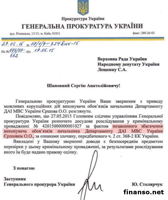 По факту незаконного обогащения Александра Ершова, бывшего исполняющего обязанности начальника департамента Госавтоинспекции МВД Украины, Главным следственным управлением Генеральной прокуратуры Украины начато досудебное расследование по открытому в ведомстве уголовному производству. Такое сообщение (согласно полученному ответу украинской Генпрокуратуры на сделанный запрос) на своей странице в соцсети «Фейсбук» обнародовал народный депутат Сергей Лещенко. Об этом пишут корреспонденты издания «
