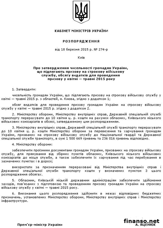 Своим распоряжением правительство Украины перенесло завершение призыва на срочную военную службу в Вооруженные силы Украины с мая месяца на конец июня.Корреспондентам издания «Украина сегодня: Finanso.net» удалось выяснить, что в распоряжении правительства от 4 июня, которое было опубликовано в понедельник, 8 июня 2015 года, говорится, что Кабинет министров Украины продлил проведение призыва на срочную военную службу до конца июня. В соответствии с документом, Кабмин перенес завершение призыва с мая на июнь. Сообщим, что соответствующие изменения были внесены в распоряжение №274 от 18 марта, которое и определяло сроки проведения призыва на срочную службу в Вооруженные силы Украины. В опубликованном на правительственном сайте документе говорится о внесении в распоряжение Кабмина Украины от 18 марта 2015 г. № 274 «Об утверждении численности граждан Украины, подлежащих призыву на срочную военную службу, объема расходов для проведения призыва в апреле - мае 2015 года» следующих изменений: в названии и пунктах 1 и 5 распоряжения слово «мае» заменить словом «июне», в названии приложения 1 и 2 к распоряжению слово «мае» заменить словом «июне». Президент Украины Петр Порошенко ранее своим указом продлил срок действия призыва на срочную военную службу до июня. Срок призыва граждан на военную службу, о чем следует напомнить, начался 1 апреля текущего года. Планировалось при этом, что он продлится до конца мая. По данным украинского оборонного ведомства, на службу за это время должны были призвать 21 тысячу украинцев. На срочную военную службу подлежат призыву здоровые мужчины, ко дню отправления на службу которым исполнилось двадцать лет и которые еще не достигли 27-летнего возраста, а также граждане этого возраста, не имеющие права на отсрочку или освобождение от призыва. Военнослужащие срочной службы не будут отправляться в зону АТО.Указанные военнослужащие срочной службы не будут отправляться в зону антитеррористической операции в Донбассе. В соответствии с текстом указанного документа, предполагается призвать в Днепропетровской области – 1630 человек, Львовской - 1 450, Хмельницкой - 1 380, Одесской - 1 340, Винницкой - 1 300, Харьковской - 1 200, Кировоградской - 1 100, Николаевской - 1 050, Киевской - 950, Житомирской - 926, Запорожской и Полтавской - по 900, в Киеве и Херсонской области - по 800. Также украинский Кабмин распорядился призвать в Черниговской и Сумской области по 700 человек, Черкасской - 640, Ровенской - 600, Тернопольской - 520, Ивано-Франковской - 500, Волынской, Закарпатской и Черновицкой - по 480, Донецкой - 200 и Луганской - 100 человек. Напомним, что по сегодняшнему заявлению руководителя оборонного ведомства Украины Степана Полторака, информируют СМИ, вдоль украинской границы РФ держит армейскую группировку в составе около 55 тысяч военнослужащих. Эта группировка Российской Федерации имеет на вооружении около трех тысяч семисот единиц различного вида оружия и техники и может быть использована для наращивания возможностей незаконных вооруженных формирований. По оценкам украинского Минобороны, число террористов на оккупированной территории Донецкой и Луганской областей достигает 42,5 тысячи человек при 550 танках. |