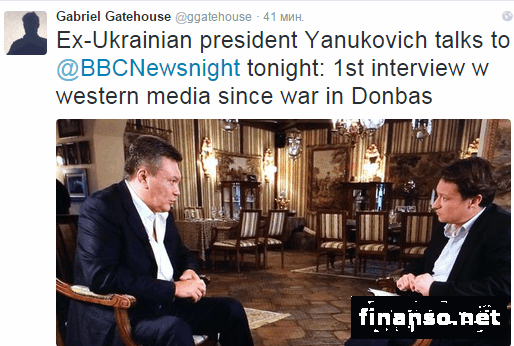 В своем микроблоге корреспондент ВВС Габриэл Гейтхаус сообщил, что бывший президент Украинского государства Виктор Янукович дал свое первое интервью западным средствам массовой информации после гибели сына В. Януковича-младшего.