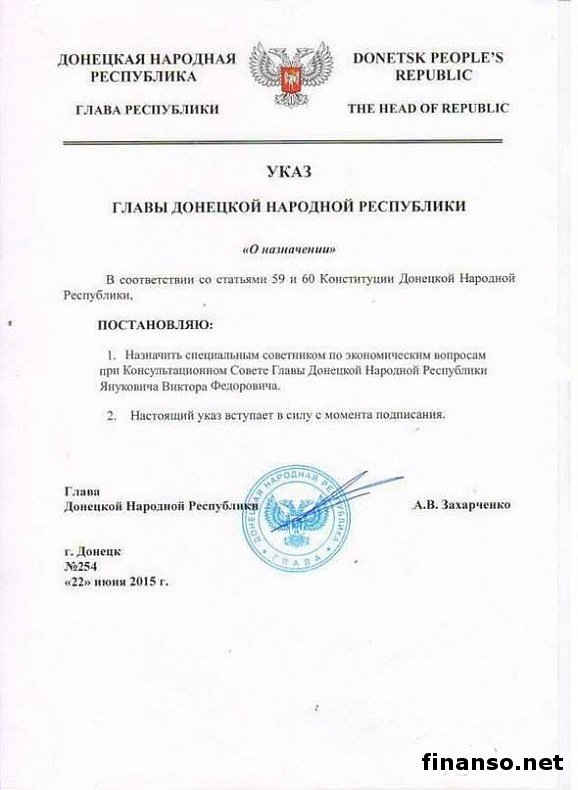 В понедельник, 22 июня, как сообщается, Александр Захарченко подписал «указ» о назначении своим «спецсоветником по экономическим вопросам при Конституционном Совете руководителя ДНР» Виктора Януковича. Серийный номер этого указа – 254. Фото этого указа выложили в Сети, однако в достоверности этого документа многие выражают сомнение. Напомним, что Роман Храменков, который был назначен «мэром» донецкой Горловки таким же «указом» главаря ДНР Захарченко, оказался близким родичем бывшего украинского президента Виктора Януковича, бежавшего со своей должности полтора года назад в РФ. По заявлению В. Януковича, территории ЛНР и ДНР должны оставаться в составе Украины.Напомним также, что в опубликованном накануне интервью украинского экс-президента Виктора Януковича одному из британских СМИ он заявил, что контролируемые в настоящее время территории ЛНР и ДНР должны оставаться в составе Украины. По его мнению, сев за стол переговоров, необходимо договариваться, достигать компромисса и начать выполнять Минские соглашения. «Украинские власти, - считает бывший президент, - с лидерами боевиков в Донбассе должны вести прямые переговоры». Большую часть времени экс-президент проводит в Ростове, где его постоянно сопровождает охрана. Он заявил, кроме того, что желает вернуться в Украину. Виктором Януковичем также было заявлено, что он несет ответственность за расстрел на Майдане протестующих. В ходе своего интервью западной прессе бывший украинский президент рассказал, что ему не принадлежало все имение в Межигорье, где он в свое время проживал. Его владение там составляло только 630 квадратных метров, приобретенные им за три миллиона долларов США, которые он официально задекларировал. Находившаяся внутри дома дорогая мебель, как сообщил бывший руководитель Украинского государства, ему не принадлежала. От обнаруженного в Межигорье зоопарка в то же время Виктор Янукович открестился. Отвечая на вопрос корреспондента западных средств массовой информации, он сказал, что животные просто там жили, а у него времени не было для того, чтобы там бывать, хотя он очень любит животных. |