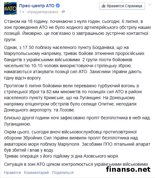 В районе Богдановки Донецкой области, что на Мариупольском направлении, в 17 часов 50 минут две группы пехоты самопровозглашенной Донецкой народной республики численностью 10-15 человек начали атаку позиций сил антитеррористической операции. Бой между пророссийскими террористами и силами АТО длится уже более двух часов.Как передают корреспонденты издания «Украина сегодня: Finanso.net», об этом на своей странице в социальной сети «Фейсбук» сообщает пресс-центр антитеррористической операции. Так, в сообщении на официальной странице штаба антитеррористической операции в социальной сети «Фейсбук» говорится: «С 17 часов 50 минут вблизи населенного пункта Богдановка Донецкой области, что на Мариупольском направлении, продолжается боевое столкновение пророссийских бандитов с украинскими военными. Две группы пехоты боевиков численностью десять-пятнадцать человек, используя стрелковое оружие, пытаются атаковать позиции сил антитеррористической операции. Защитники Украины дают достойный отпор врагу». Помимо прочего, в штабе антитеррористической операции уточнили, что в случае если не считать боя у Богдановки, обстрелов со стороны террористов сегодня не было зафиксировано. Ситуация в зоне АТО.На протяжении дня время от времени раздавались выстрелы из стрелкового оружия и 82-миллиметровых минометов по позициям сил антитеррористической операции в Луганской области в районе населенного пункта Крымское. В свою очередь на Донецком направлении эпицентром обстрелов были поселки Лозовое и Опытное. Кроме того, бойцы Вооруженных сил Украины зафиксировали сегодня около двух часов ночи пролет беспилотного летательного аппарата в небе над Луганской областью. Также был замечен вражеский беспилотник над акваторией моря вблизи города Мариуполя. Средствами противовоздушной обороны летательный аппарат был сбит и упал в воду – в настоящее время его поднимают на поверхность. В сообщении пресс-центра АТО говорится: «Около второго часа ночи зафиксирован пролет беспилотника в небе над Луганщиной. Кроме этого, сегодня ночью военнослужащие противовоздушной обороны Вооруженных сил Украины обнаружили пролет беспилотника над акваторией моря вблизи Мариуполя. Средствами ПВО летательный аппарат был сбит и упал в воду». |