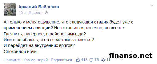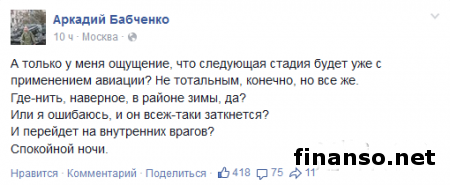 Как удалось выяснить корреспондентам издания «Украина сегодня: Finanso.net», при этом журналист добавил: «Следующая стадия будет уже с применением авиации. А только у меня такое ощущение, что ли? Конечно, не тотально, но все же. Где-то, наверное, в районе зимы». В это же время журналист допускает возможность прекращения войны, но только в том случае, если Путин переключится с Украины на внутренних врагов. Также Аркадий Бабченко добавил: «Или он все-таки заткнется, и я ошибаюсь? И перейдет на внутренних врагов?». Путин может заморозить конфликт на Донбассе.Напомним, ранее вчера издание «Украина сегодня: Finanso.net», ссылаясь на сообщение политолога, публициста и ведущего научного сотрудника Института системного анализа РАН Андрея Пионтковского, которое он сделал во время интервью одному из телеканалов, предоставило информацию о том, что президент Российской Федерации Владимир Путин принял решение заморозить конфликт на украинском Донбассе, что, конечно же, для России является проигрышным вариантом. Так, в соответствии с сообщением эксперта, «Российская Федерация переходит к варианту де-факто аннексии Донбасса. Кремль перестанет даже уже это засовывать обратно. Удивительно, по каким причинам они начали отходить от каких-то спорных деревень: Широкино там и так далее?.. Де-факто аннексия, замороженный конфликт, то есть что-то, похожее на ситуацию, сложившуюся в Южной Осетии». Согласно словам Андрея Пионтковского, российского политолога, хвастовство присоединенными Автономной Республикой Крым и частью украинского Донбасса может помочь российскому лидеру Владимиру Путину «продать что-то патриотическому электорату». Примечательно, что, помимо всего прочего, Андрей Пионтковский высказал свое мнение, что де-факто аннексия является выгодной для всех сторон, за исключением самой Российской Федерации. |