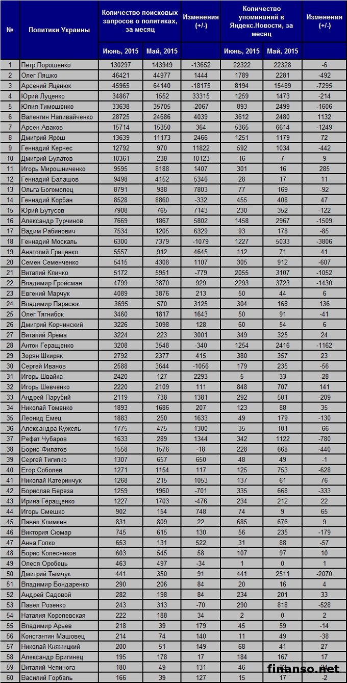 Непрекращающиеся военные действия, очень сложная экономическая и финансовая обстановка по всей Украине не могут оставить равнодушным никого из граждан страны, потому что каждый переживает не только за свое будущее, но и за будущее всей семьи. По этой простой причине им особенно важен рейтинг известности каждого отдельно взятого политика. Подробностями интересовались корреспонденты издания «Украина сегодня: Finanso.net». Но чья именно жизнь и политическая деятельность больше всего интересна жителям Украины? Каким именно образом распределились позиции в рейтинге известности? С этим вопросом пытались разобраться специалисты портала по экономике и финансам «Биржевой лидер». Рейтинг количества запросов поиска об украинских политиках в сети, цитируемость их в онлайн-СМИ: Следующие не менее важные критерии оценки популярности украинских политиков: - количество запросов поиска за один месяц в системе поиска Яндекс (сервис www.wordstat.yandex.ua) - число упоминаний за то же самое время о политике в онлайн–СМИ, электронных информагентствах, что рассчитано с помощью агрегатора Яндекс.Новости (news.yandex.ua); - регион оценки - Украина. ТОП украинских политиков в Интернете.Самая большая популярность среди украинцев в Сети зафиксирована у Петра Алексеевича Порошенко (130 297 запросов за месяц в системе поиска Яндекс) - президента Украины, избранного в первом туре внеочередных выборов 25 мая прошлого года, Верховного главнокомандующего Вооруженными силами страны. Второе не менее почетное место завоевал на этот раз по своей популярности Олег Валерьевич Ляшко (46 421 запрос за месяц в Яндекс), украинский народный депутат, бывший кандидат в украинские президенты на выборах прошлого года, глава Радикальной партии, а также активный участник Евромайдана. Третья позиция рейтинга в этом месяц досталась Арсению Петровичу Яценюку (45 965 запросов в системе поиска Яндекс за последний месяц) - украинскому премьер-министру с 27 февраля прошлого года. Раньше он занимал пост министра иностранных дел, министра экономики, являлся председателем украинской Верховной Рады, стоял во главе политической партии «Фронт перемен». Менее известными политиками в Яндексе признаны: - Юрий Луценко – 34 867 запросов в Яндекс; - Юлия Тимошенко – 33 638 запросов в Яндекс; - Валентин Наливайченко – 28 725 запросов в Яндекс; - Арсен Аваков – 15 714 запросов в Яндекс; - Дмитрий Ярош – 13 639 запросов в Яндекс; - Геннадий Кернес – 12 792 запроса в Яндекс; - Дмитрий Булатов – 10 361 запрос в Яндекс. |