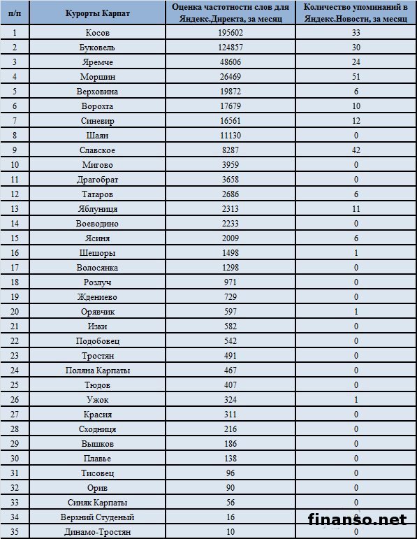 Чарующие украинские Карпаты манят граждан из самых разных уголков мира не просто в качестве самого лучшего лыжного курорта. Ведь здесь прекрасный горный воздух, прозрачные реки, озера, склоны гор, лечебные источники, бурлящие водопады. Вся западная часть страны, где располагаются Карпатские горы, богата санаториями, пансионатами, горнолыжными курортами. Как раз здесь сосредоточены самые лучшие лыжные курорты государства. В зимнее время Карпаты - это просто сказка. Даже если зимний спорт не вдохновляет, здесь есть, чем заняться. Украинские лыжные курорты отлично подходят для отдыха всей семьей, для влюбленной пары, для целой компании друзей. Уютные гостиницы, снежные вершины гор, украинская кухня, гуцульский национальный колорит обеспечат приятный отдых и зимой, и летом. Подробностями интересовались корреспонденты издания «Украина сегодня: Finanso.net». Какие именно украинские курорты в Карпатах пользуются самой большой известностью среди украинцев? Ответ на этот вопрос искали специалисты сайта «Биржевой лидер». Наиболее известные курорты Карпат в Сети.Рейтинг известности курортов Карпат формировался на базе таких критериев: - оценка частотности слов для системы поиска Яндекс.Директ за месяц, что рассчитана при помощи специального сервиса wordstat.yandex.ru; - частота упоминаний о курортах, что рассчитана с помощью агрегатора news.yandex.ru (Яндекс.Новости); - регион анализа (то есть поиска в сервисе wordstat.yandex.ru) – Украина. Лидер популярности на рынке туруслуг Карпат в текущем месяце – Косов (195 602 запроса в системе поиска Яндексе за последний месяц) – это культурно-туристический центр Гуцульщины. Он хорошо известен благодаря своему сувенирному рынку, сероводородным источникам, горнолыжным курортам. Также есть одна трасса рядом с центром города, один бугельный подъемник. На втором не менее почетном месте находится в текущем месяце курорт «Буковель» (124 857 запросов в системе поиска Яндексе за последний месяц). Это самый большой горнолыжный курорт страны, что за счет большого числа и отличного состояния трасс, а также развитой инфраструктуры соответствует самым лучшим европейским горнолыжным курортам, ему уступают все остальные лыжные курорты Украины. Третье место – Яремче (48 606 запросов в системе поиска Яндекс за последний месяц) - один из лучших курортов, основной турцентр Прикарпатья с большим выбором развлечений, гостиниц. |