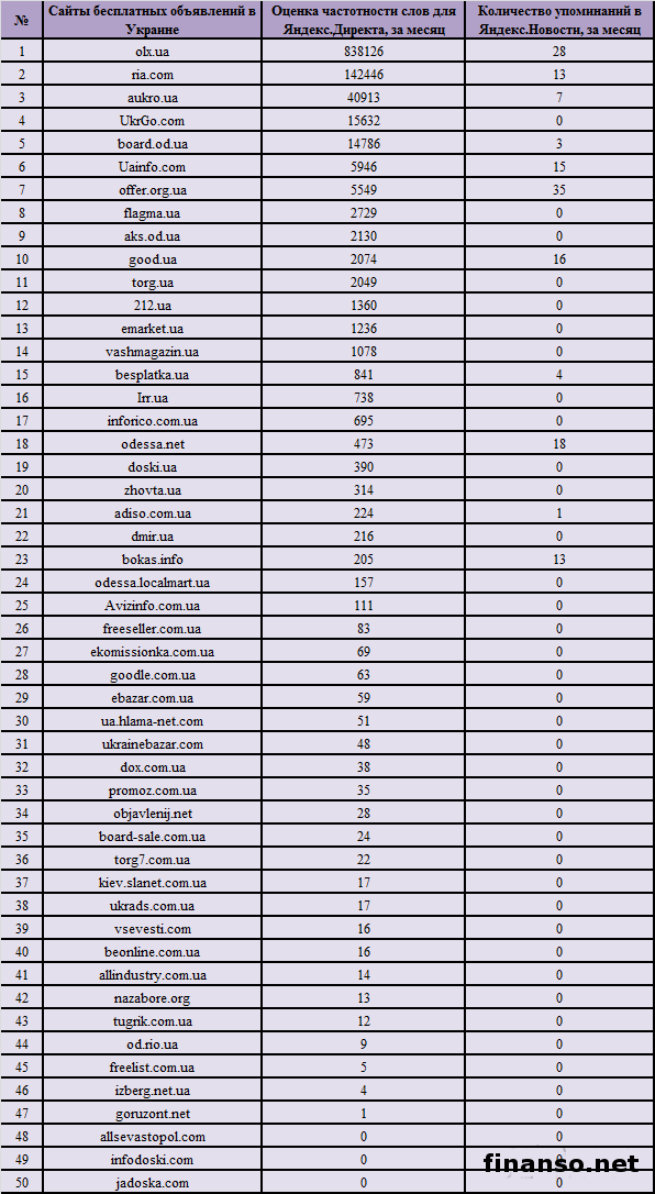 Самым качественным инструментом рекламы, продвижения в сети Интернет принято считать по праву бесплатные объявления на онлайн-досках. Именно с их помощью можно результативно и достаточно быстро поднять уровень известности любого web-ресурса. Объявления на досках имеют фактически неограниченный потенциал для креативности и раскрутки, то есть их применение ведет к явному росту посещаемости того или другого портала в поисковой выдаче. Подробностями интересовались корреспонденты издания «Украина сегодня: Finanso.net». По информации издания «Биржевой лидер», сейчас в Украине действует огромное количество порталов бесплатных объявлений. И тем не менее сделать выбор в пользу самого эффективного ресурса самостоятельно среди подобного разнообразия бывает достаточно трудно. Какие именно интернет-ресурсы бесплатных объявлений в настоящее время пользуются самой большой популярностью у граждан Украины? Ответ на этот вопрос искали аналитики известного портала для инвесторов и экономистов «Биржевой лидер». Оlx.ua - наиболее известный портал бесплатных объявлений Украины.Рейтинг известности порталов бесплатных объявлений был сформирован на основе трех основных критериев: - оценка частотности слов для системы поиска Яндекс.Директ за последний месяц, что рассчитана при помощи сервиса wordstat.yandex.ru; - частота упоминаний о порталах в интернет-изданиях РФ, что рассчитана при помощи агрегатора news.yandex.ru (Яндекс.Новости); - регион анализа (то есть поиска в сервисе wordstat.yandex.ru) – Украина. Самые известные сайты бесплатных объявлений среди украинцев в сети Интернет: - olx.ua – 838 126 запросов в системе поиска Яндекс за месяц; - ria.com - 142 446 запросов в системе поиска Яндекс за месяц; - aukro.ua – 40 913 запросов в системе поиска Яндекс за месяц; - UkrGo.com – 15 632 запроса в системе поиска Яндекс за месяц; - board.od.ua – 14 786 запросов в системе поиска Яндекс за месяц; - Uainfo.com – 5 946 запросов в системе поиска Яндекс за месяц; - offer.org.ua – 5 549 запросов в системе поиска Яндекс за месяц; - flagma.ua – 2 729 запросов в системе поиска Яндекс за месяц; - aks.od.ua – 2 130 запросов в системе поиска Яндекс за месяц; - good.ua – 2 074 запроса в системе поиска Яндекс за месяц. Аутсайдеры рейтинга популярности: - od.rio.ua - 9 запросов в системе поиска Яндекс за месяц; - freelist.com.ua - 5 запросов в системе поиска Яндекс за месяц; - izberg.net.ua - 4 запроса в системе поиска Яндекс за месяц; - goruzont.net - 1 запрос в системе поиска Яндекс за месяц. |
