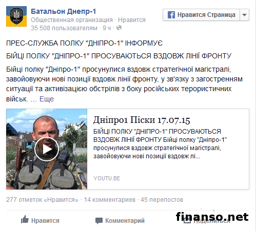 На своей странице в социальной сети «Фейсбук» бойцы батальона «Днепр-1» сообщили, что вблизи Донецка огнем расчета СПГ-9 уничтожили две казармы и минометную батарею боевиков.Как удалось выяснить корреспондентам издания «Украина сегодня: Finanso.net», в сообщении говорится: «Бойцы полка «Днепр-1» продвинулись вдоль стратегической магистрали, завоевывая новые позиции вдоль линии фронта, в связи с активизацией выстрелов со стороны российских террористических войск и обострением ситуации в зоне проведения антитеррористической операции». Помимо прочего, бойцам полка «Днепр-1» удалось разминировать дороги и поля в районе Песок, что вблизи аэропорта города Донецка. Силовики закрепились и удерживают занятые позиции. Ситуация в зоне АТО.Вдоль российско-украинской границы на территории Украинского государства количество военных армии РФ превысило 50 тысяч человек. Заместитель руководителя штаба антитеррористической операции полковник Сергей Галушко на брифинге журналистам в Антикризисном медиа-центре в Краматорске Донецкой области в пятницу, 17 июля текущего года, заявил, что количество российских военных также возросло и вдоль границ с государствами-членами Европейского союза и Североатлантического альянса. Так, Сергей Галушко проинформировал: «В соответствии с данными Атлантического совета, на территории Украины и вдоль ее границы растет количество российских военнослужащих. В настоящее время количество вражеских войск превышает 50 тысяч человек». В соответствии со словами С. Галушко, Атлантический совет также сообщает о фактах увеличения количества российских военнослужащих на границах с государствами-членами Европейского союза и НАТО на востоке Европы. Во время пресс-конференции заместитель руководителя штаба антитеррористической операции проинформировал о завершении третьего этапа строительства фортификационных сооружений трех линий обороны в зоне АТО. |