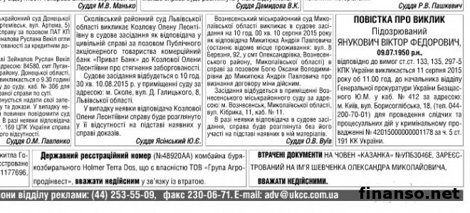 В Украине в официальном издании центральных органов исполнительной власти «Урядовый курьер» была опубликована повестка Генеральной прокуратуры Украины бывшему главе Украинского государства Виктору Януковичу. Как передают корреспонденты издания «Украина сегодня: Finanso.net», соответствующая повестка была опубликована в номере от 6 августа 2015 года. В повестке указано, что для проведения следственных и процессуальных действий в уголовном производстве бывший президент Виктор Янукович вызывается в Генеральную прокуратуру Украины к начальнику отдела Юрию Безщасному на 11 августа на 11 часов 00 минут. Как сообщалось ранее, Печерский районный суд Киева, 27 июля 2015 года разрешил проведение Генеральной прокуратурой заочного расследования против Виктора Януковича. Азаров призывает арестовать Януковича.Напомним, также ранее в средствах массовой информации появилось сообщение о том, что во время пресс-конференции в Москве бывший глава правительства Украины Николай Азаров призвал арестовать экс-президента Украины Виктора Януковича. Такое свое требование бывший премьер заявил во время заседания так званого «Комитета по спасению Украины». Помимо прочего в это же время Николай Азаров представил «кандидата на пост президента» Украины – бывшего члена Партии регионов Владимира Олейника. Таким образом, можно понять, что беглец Азаров проявляет огромное желание провести в Украине выборы во все органы власти. Примечательно, что в Кремле заявили, что якобы не имеют абсолютно никакого отношения к инициативе создания комитета спасения Украины и выборам его руководителем Владимира Олейника. Такую информацию журналистам предоставил пресс-секретарь президента Российской Федерации Владимира Путина Дмитрий Песков. Так, Песков заявил: «Безусловно, в Кремле не имеют никакого отношения к этой инициативе. По согласованию этой инициативы с какими-либо властями здесь, в России, и тем более, по согласованию кандидатуры Олейника речь идти не могла и не может». |