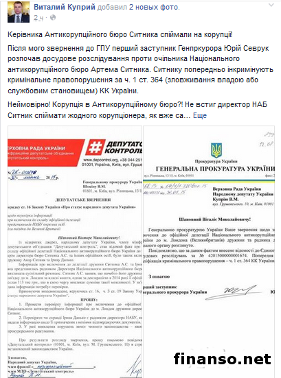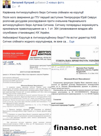 По факту включения в официальный состав делегации Национального антикоррупционного бюро Украины в Лондон супруги и советника директора данного органа Артема Сытника Генеральная прокуратура внесла в Единый реестр досудебных расследований соответствующие сведенья.Как удалось выяснить корреспондентам издания «Украина сегодня: Finanso.net», скан-копию соответствующего ответа на официальный депутатский запрос внефракционного народного избранника, представителя межфракционного объединения «Депутатский контроль» Виталия Куприна с подписью первого заместителя генерального прокурора Украины Юрия Севрука был опубликован на официальной странице парламентария в социальной сети «Фейсбук» сегодня, 13 августа 2015 года. Как известно, сведения в Единый реестр досудебных расследований внесены под №42015000000001674. Отметим, что предварительно правонарушение квалифицируется по части 1 статьи 364 Уголовного кодекса Украины – «Злоупотребление властью или служебным положением». В обращении народного депутата Украины Виталия Куприя, скан-копия которого обнародована, отмечается, что о включении супруги Артема Сытника Анны и его советника Ирины Данько парламентарию стало известно «из открытых источников» и что эта информация «вызвала общественный резонанс». В соответствии с его словами, Артем Сытник якобы заявил, что его супруга осуществляла поездку в Лондон за собственный счет, однако в декларации за минувший год указан годовой доход всего 113 тысяч гривен, что, собственно говоря, и «вызывает сомнения в такой возможности» и требует тщательной проверки. Также народный депутат Украины в своем обращении просит проверить, действительно ли Ирина Данько является советником Артема Сытника, и предоставить подтверждающие ее назначение на эту должность документы. На своей странице в социальной сети «Фейсбук» Виталий Куприй заявил, что «сначала глава Национального антикоррупционного бюро утверждал, что Анна Ситник входила в официальную делегацию, однако позже начал твердить, что она ехала как частное лицо за свой счет». |